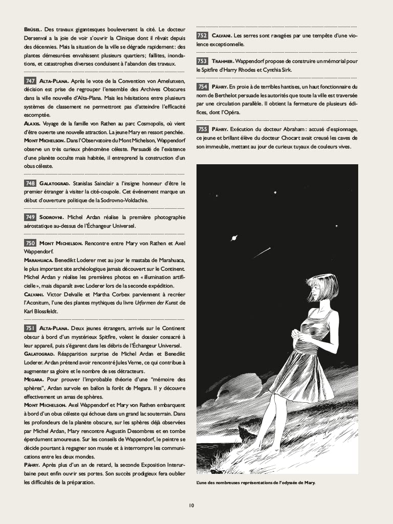 Trente-sept ans après les débuts de la série dans le journal (A suivre), cet ultime volume de la saga reprend les histoires les plus récentes : La Frontière invisible (2004), La Théorie du grain de sable (2008), Souvenirs de l’éternel présent (2009), ainsi que de nombreux compléments sur les personnages et le monde des Cités obscures…