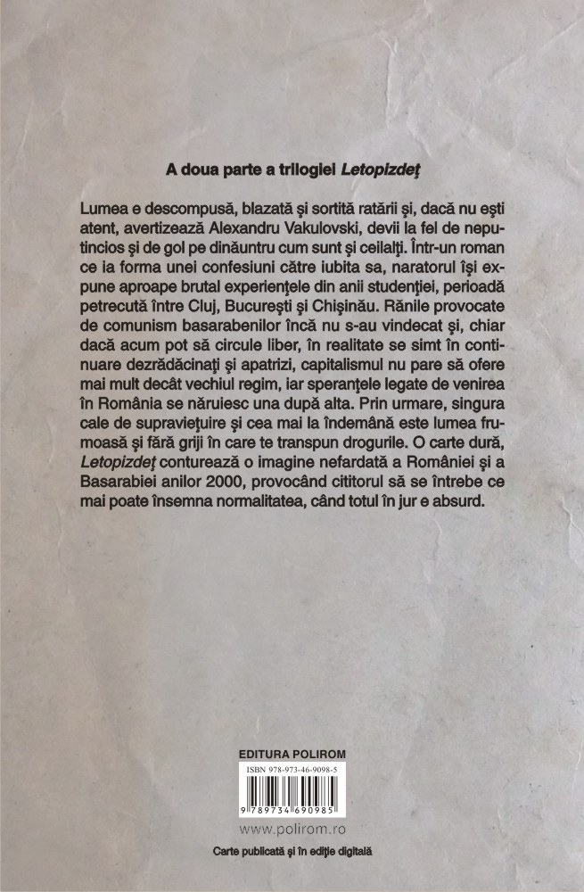 Lumea e descompusă, blazată și sortită ratării și, dacă nu ești atent, avertizează Alexandru Vakulovski, devii la fel de neputincios și de gol pe dinăuntru cum sunt și ceilalți. Într-un roman ce ia forma unei confesiuni către iubita sa, naratorul își expune aproape brutal experiențele din anii studenției, perioadă petrecută între Cluj, București și Chișinău. Rănile provocate de comunism basarabenilor încă nu s-au vindecat și, chiar dacă acum pot să circule liber, în realitate se simt în continuare dezrădăcinați și apatrizi, capitalismul nu pare să ofere mai mult decât vechiul regim, iar speranțele legate de venirea în România se năruiesc una după alta. Prin urmare, singura cale de supraviețuire și cea mai la îndemână este lumea frumoasă și fără griji în care te transpun drogurile. O carte dură, Letopizdeț conturează o imagine nefardată a României și a Basarabiei anilor 2000, provocând cititorul să se întrebe ce mai poate însemna normalitatea, când totul în jur e absurd.