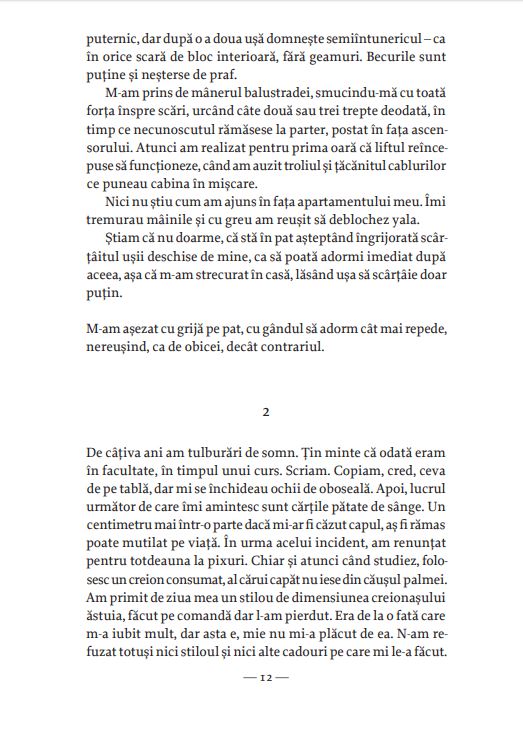 „Liftul este un roman care s-a așternut aproape singur pe hârtie în intervalul unui an. Ideea mi-a venit aflând că cei doi colegi cu care lucrez într-un laborator de fiabilitate (facem teste pentru produse Huawei) au primit amândoi câte o mașină de dormit concepută pentru persoanele care suferă de apnee (blocaje respiratorii în timpul somnului). Aparatul costă câteva mii de dolari, dar cheltuiala este rambursată aproape în totalitate de guvern (după ce în prealabil pacienților li se face o polisomnografie, o investigație complexă într-un laborator în care pacienții sunt monitorizați în timp ce dorm). Există o mască făcută la comandă pentru configurația feței tale, un tub cu oxigen, senzori de presiune, un motor silențios care asistă pacientul cu un influx de aer numai atunci când e necesar. Mi s-a părut fantastică opțiunea de a conecta mașina wireless pentru trimiterea datelor de evoluție a somnului către baza de date a doctorului specialist în tulburări de somn. Tot ce mi-a rămas de făcut a fost să mă privez intenționat de somn timp de un an, să-mi fac și eu rost de o mașină de dormit și să scriu.“