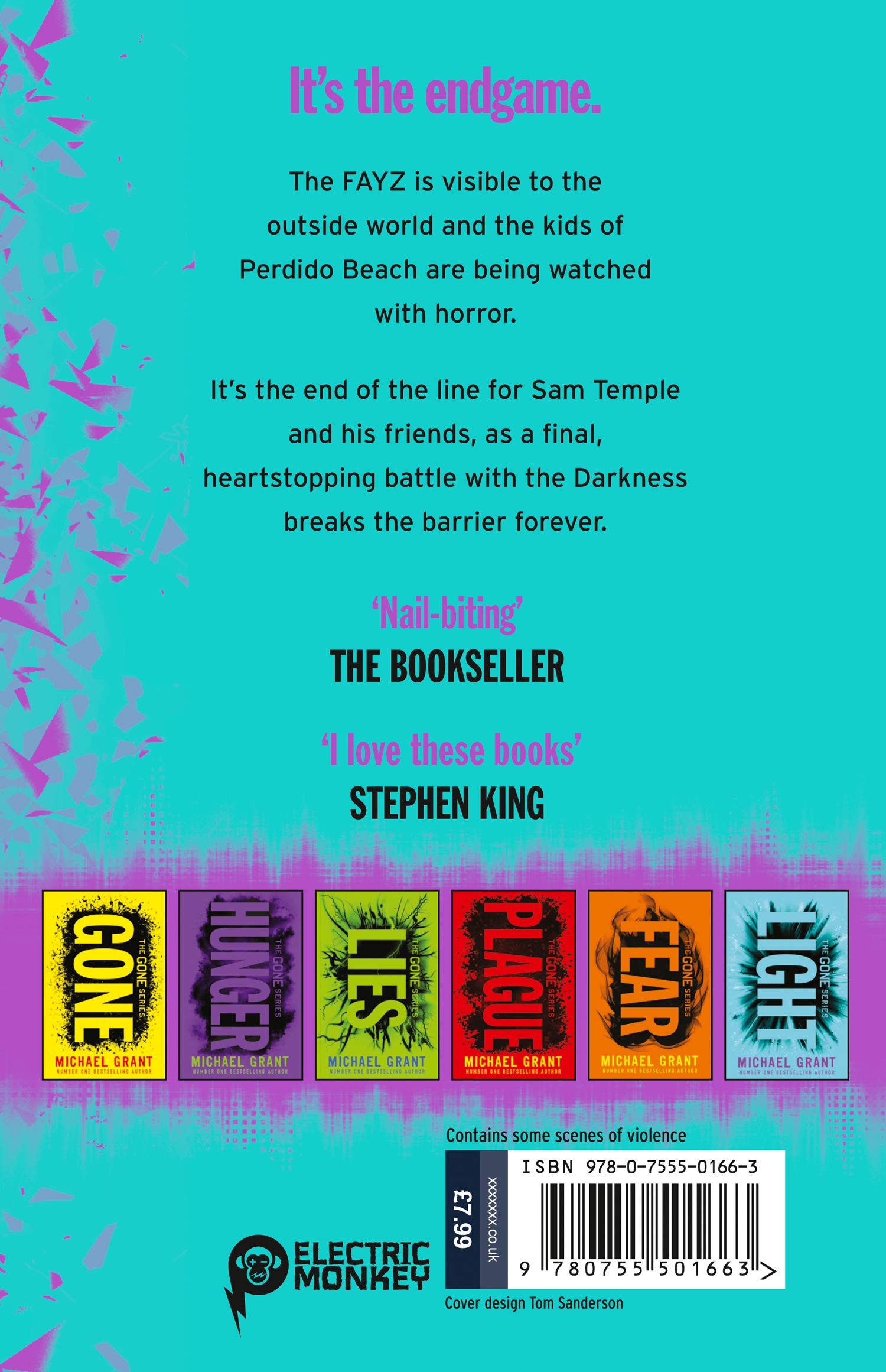 All eyes are on Perdido Beach. The barrier wall is now as clear as glass and life in the FAYZ is visible for the entire outside world to see. Life inside the dome remains a constant battle and the Darkness, away from watchful eyes, grows and grows … The society that Sam and Astrid have struggled so hard to build is about to be shattered for good. It’s the end of the FAYZ. Who will survive to see the light of day? This is the nail-biting finale to the GONE saga.