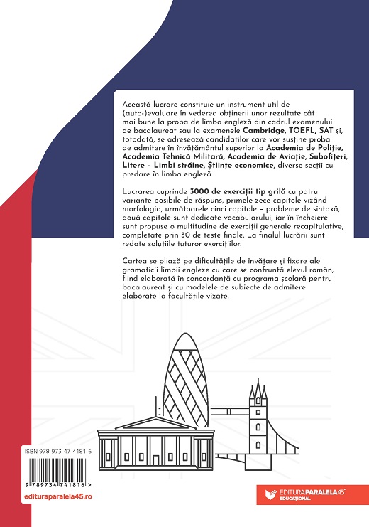 Această lucrare constituie un instrument util de (auto-)evaluare în vederea obținerii unor rezultate cât mai bune la proba de limba engleză din cadrul examenului de bacalaureat sau la examenele Cambridge, TOEFL, SAT și, totodată, se adresează candidaților care vor susține proba de admitere în învăță­mântul superior la Academia de Poliție, Academia Tehnică Militară, Academia de Aviație, Subofițeri, Litere – Limbi străine, Științe economice, diverse secții cu predare în limba engleză.