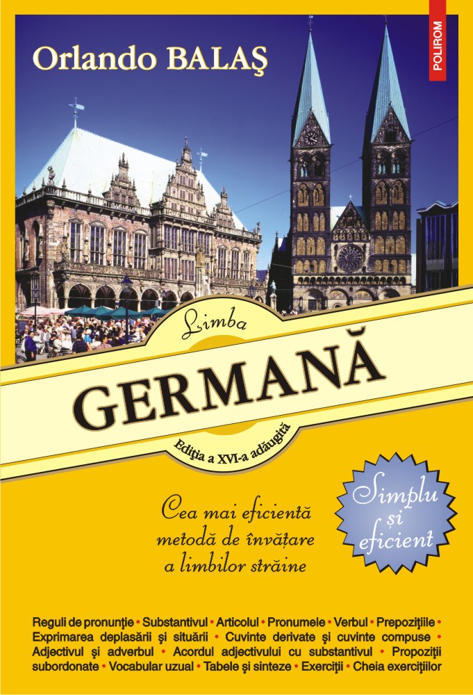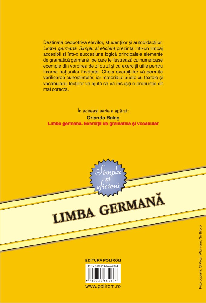 Destinată deopotrivă elevilor, studenților și autodidacților, Limba germană. Simplu și eficient prezintă într-un limbaj accesibil și într-o succesiune logică principalele elemente de gramatică germană, pe care le ilustrează cu numeroase exemple din vorbirea de zi cu zi și cu exerciții utile pentru fixarea noțiunilor învățate. Cheia exercițiilor vă permite verificarea cunoștințelor, iar materialul audio cu textele și vocabularul lecțiilor vă ajută să vă însușiți o pronunție cît mai corectă.