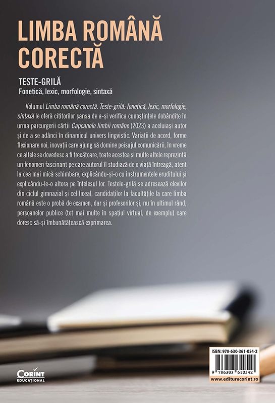 Volumul Limba română corectă. Teste-grilă: fonetică, lexic, morfologie, sintaxă le oferă cititorilor șansa de a-și verifica cunoștințele dobândite în urma parcurgerii cărții Capcanele limbii române (2023) a aceluiași autor și de a se adânci în dinamicul univers lingvistic. Variații de acord, forme flexionare noi, inovații care ajung să domine peisajul comunicării, în vreme ce altele se dovedesc a fi trecătoare, toate acestea și multe altele reprezintă un fenomen fascinant pe care autorul îl studiază de o viață întreagă, atent la cea mai mică schimbare, explicându-și-o cu instrumentele eruditului și explicându-le-o altora pe înțelesul lor.