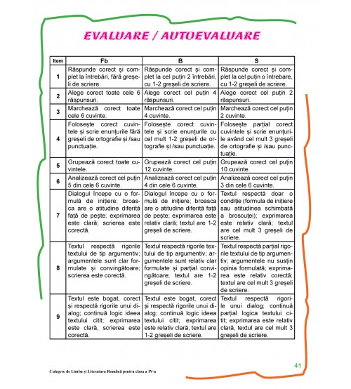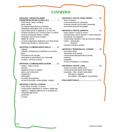 Fiecare unitate, bine structurată, pornește de la un text literar, oferind astfel un bun suport pentru lectura suplimentară. Totodată, multe dintre activitățile propuse pentru înțelegerea textului (literar sau nonliterar) sunt gândite în maniera celor de testele PIRLS. Nu au fost neglijate nici noțiunile gramaticale, gândite ca o bază pentru însușirea temeinică a limbii române, nici sugestiile pentru comunicarea orală sau scrisă.