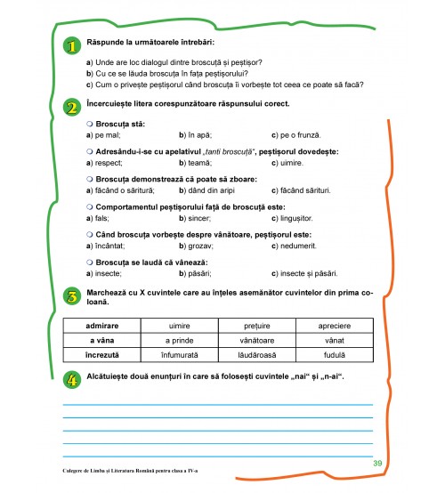 Culegerea se adresează elevilor din clasa a IV-a care vor să-și consolideze și să-și dezvolte cunostințele obținute în orele de curs, pentru a promova cu succes evaluarea națională și pentru a se adapta cu ușurință cerințelor clasei a V-a. De aceea, respectă cerințele curriculei naționale și oferă o gamă largă și atractivă de activități care pun elevul în situații de învățare inedite și cu diferite grade de dificultate.