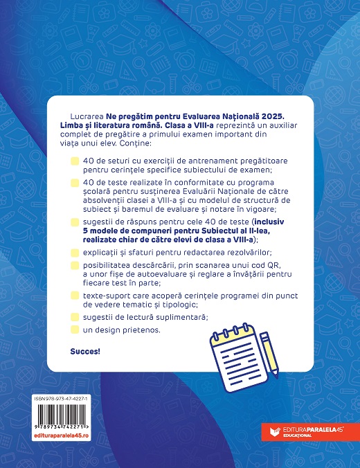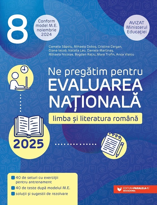 Lucrarea Ne pregătim pentru Evaluarea Naţională. Limba și literatura română. Clasa a VIII-a reprezintă un auxiliar complet de pregătire a primului examen important din viaţa unui elev.