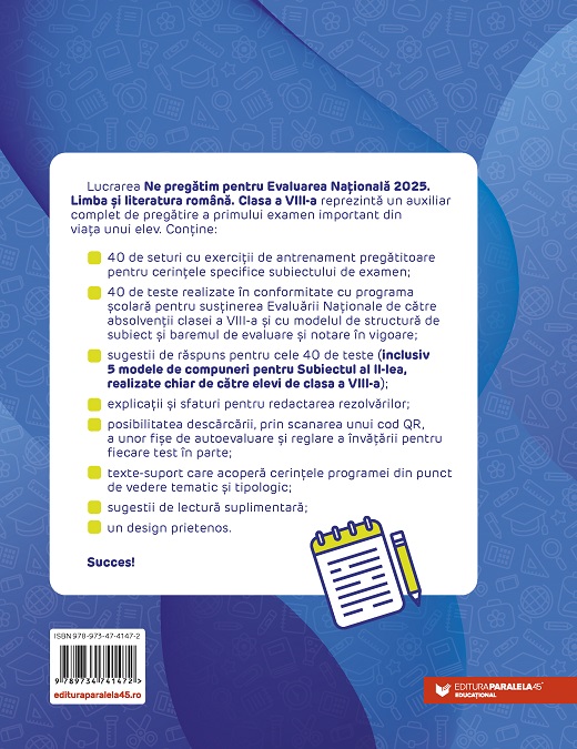 Lucrarea Ne pregătim pentru Evaluarea Naţională. Limba și literatura română. Clasa a VIII-a reprezintă un auxiliar complet de pregătire a primului examen important din viaţa unui elev.