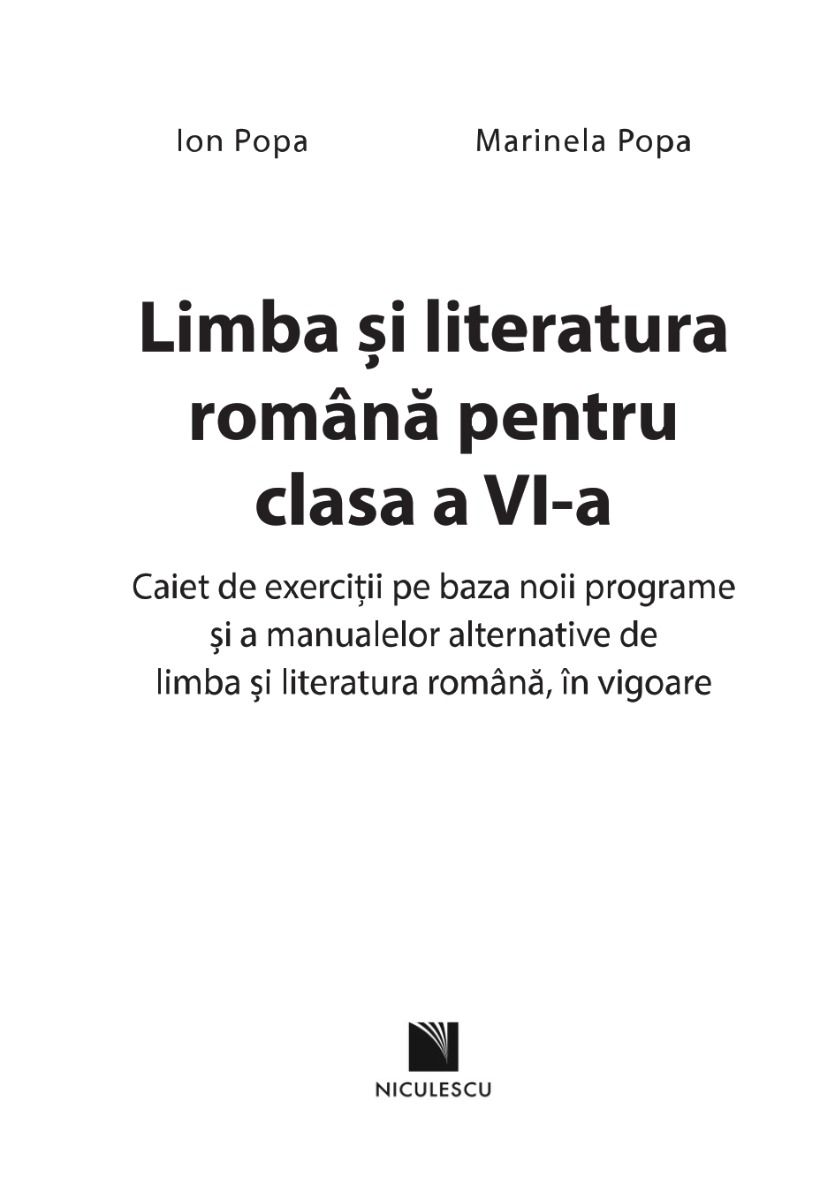 Lucrarea de fata este o continuare a lucrarii similare pentru clasa a V-a si este conceputa, ca si aceea, pe baza actualei programe si a manualelor alternative de limba si literatura romana pentru clasa a Vl-a. Ea se adre¬seaza elevilor din aceasta clasa, in vederea insusirii notiunilor prevazute in noile programe scolare. Aceasta lucrare este structurata tot pe sase uni¬tati de invatare care cuprind notiunile de limba (fonetica, vocabular, morfologie, sintaxa, punctuatie, ortografie), de teorie literara si de comu¬nicare, precum si texte literare si nonliterare apartinand tipurilor preva¬zute de programa: narative si descriptive, literare (in proza si in versuri) si nonliterare.