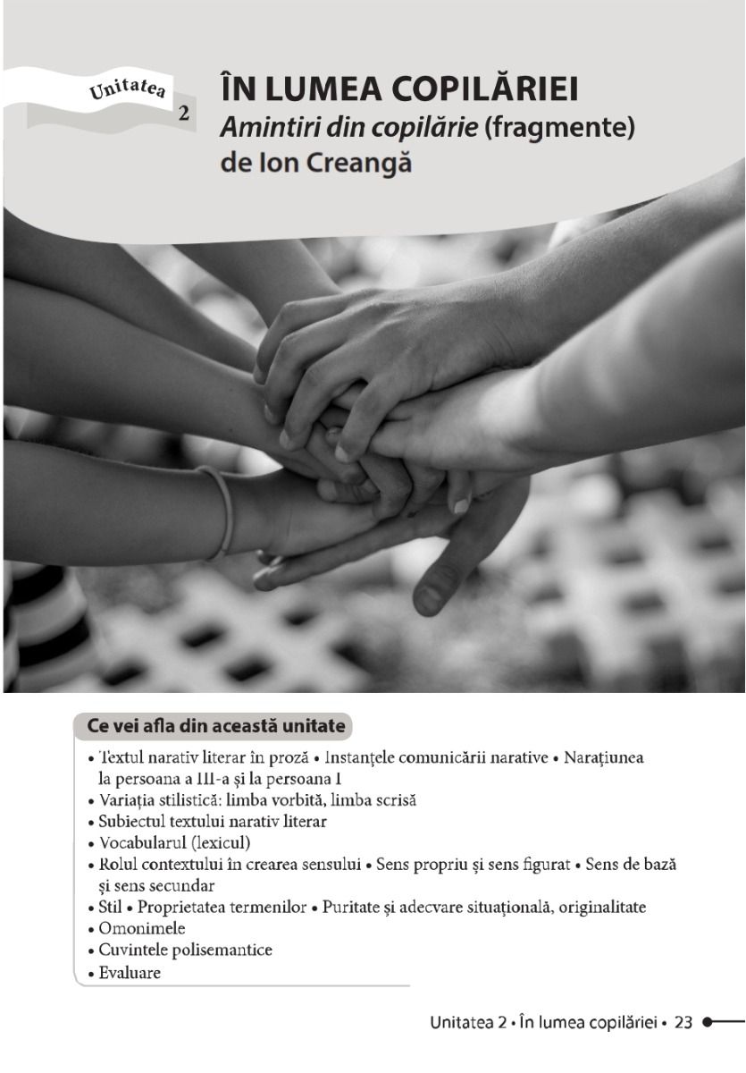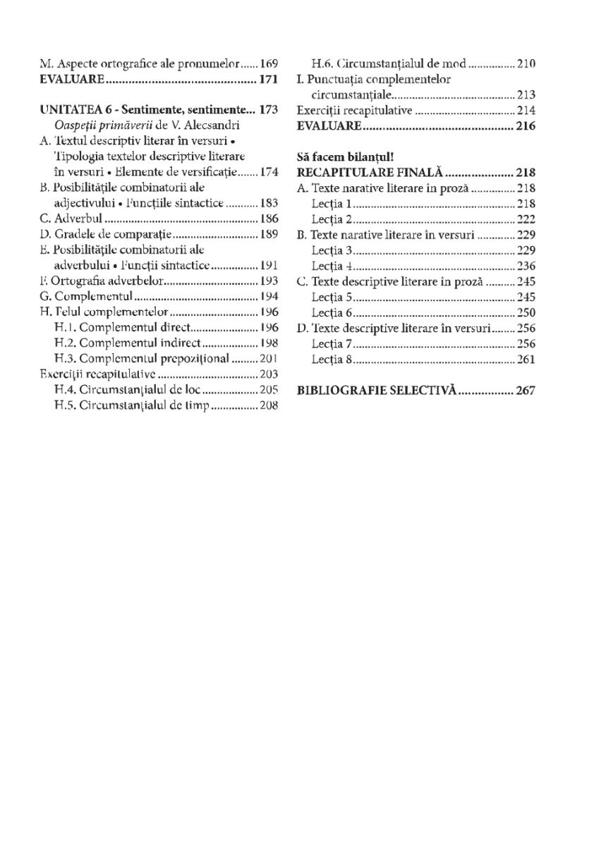 Notiunile de gramatica tratate in cadrul unitatilor de invatare respec¬tive sunt in concordanta cu prevederile programei, iar in cazul textelor narative si descriptive literare, am abordat si specii literare diferite ale acestora (fabula, balada, tablou, pastel, portret), cu scopul de a le marca diversitatea. De asemenea, ultima parte cuprinde opt lectii de recapi¬tulare finala, prin care am urmarit sa fixam si sa consolidam cunostintele de limba si de literatura dobandite in timpul anului scolar.