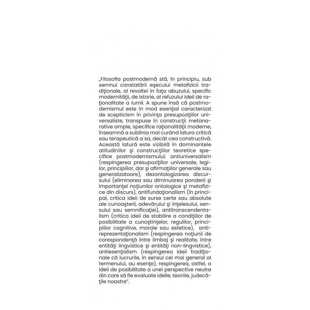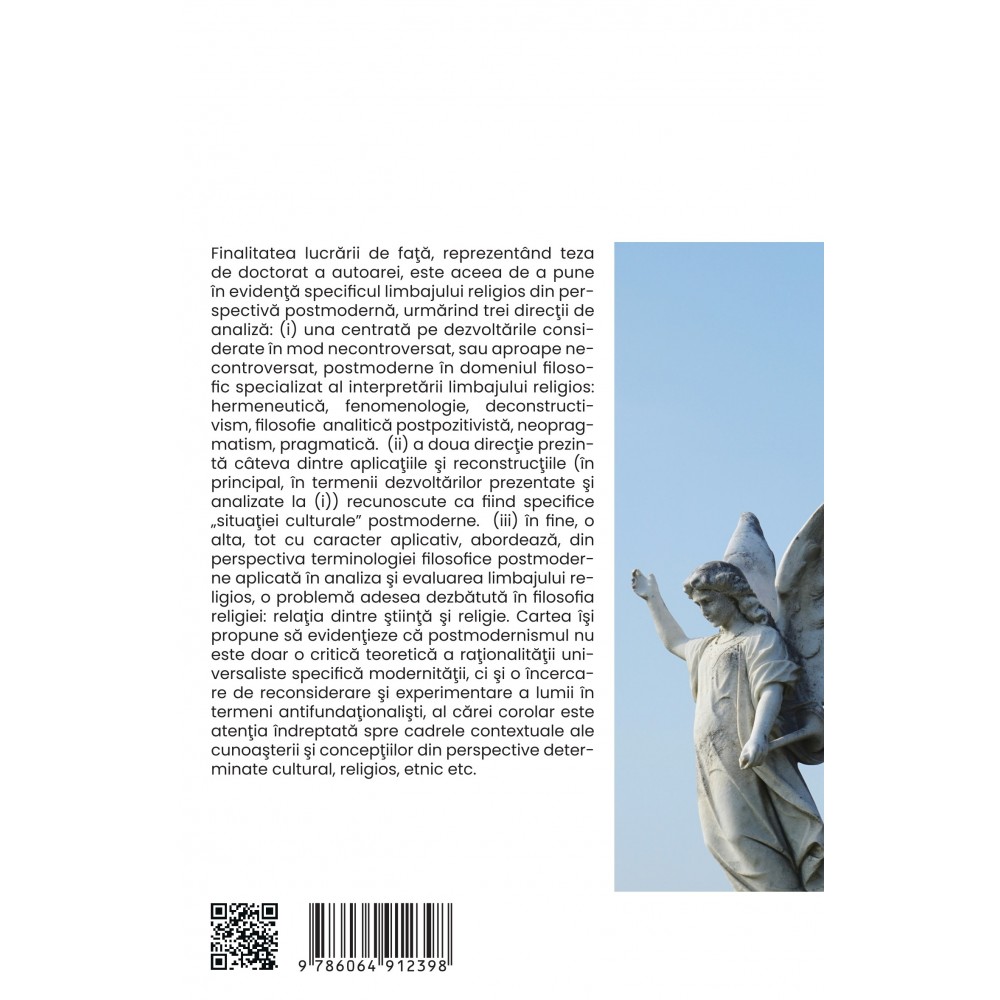 Finalitatea lucrării de faţă, reprezentând teza de doctorat a autoarei, este aceea de a pune în evidenţă specificul limbajului religios din perspectivă postmodernă, urmărind trei direcţii de analiză: (i) una centrată pe dezvoltările considerate în mod necontroversat, sau aproape necontroversat, postmoderne în domeniul filosofic specializat al interpretării limbajului religios: hermeneutică, fenomenologie, deconstructivism, filosofie analitică postpozitivistă, neopragmatism, pragmatică. (ii) a doua direcţie prezintă câteva dintre aplicaţiile şi reconstrucţiile (în principal, în termenii dezvoltărilor prezentate şi analizate la (i)) recunoscute ca fiind specifice „situaţiei culturale” postmoderne. (iii) în fine, o alta, tot cu caracter aplicativ, abordează, din perspectiva terminologiei filosofice postmoderne aplicată în analiza şi evaluarea limbajului religios, o problemă adesea dezbătută în filosofia religiei: relaţia dintre ştiinţă şi religie. Cartea îşi propune să evidenţieze că postmodernismul nu este doar o critică teoretică a raţionalităţii universaliste specifică modernităţii, ci şi o încercare de reconsiderare şi experimentare a lumii în termeni antifundaţionalişti, al cărei corolar este atenţia îndreptată spre cadrele contextuale ale cunoaşterii şi concepţiilor din perspective determinate cultural, religios, etnic etc.