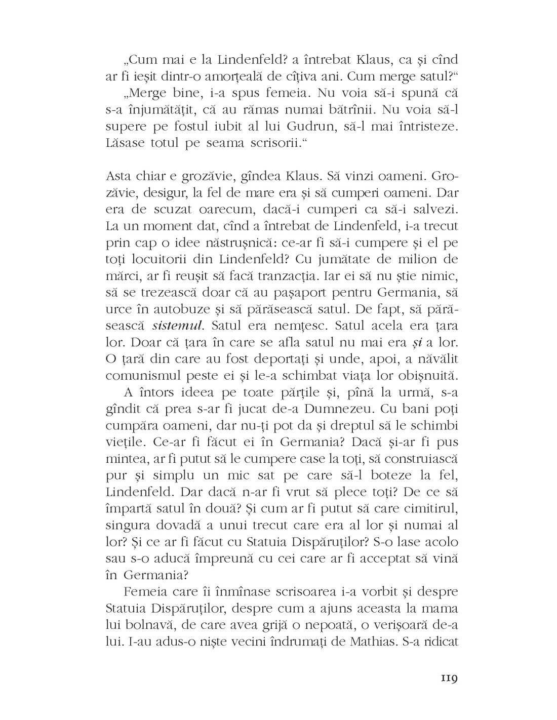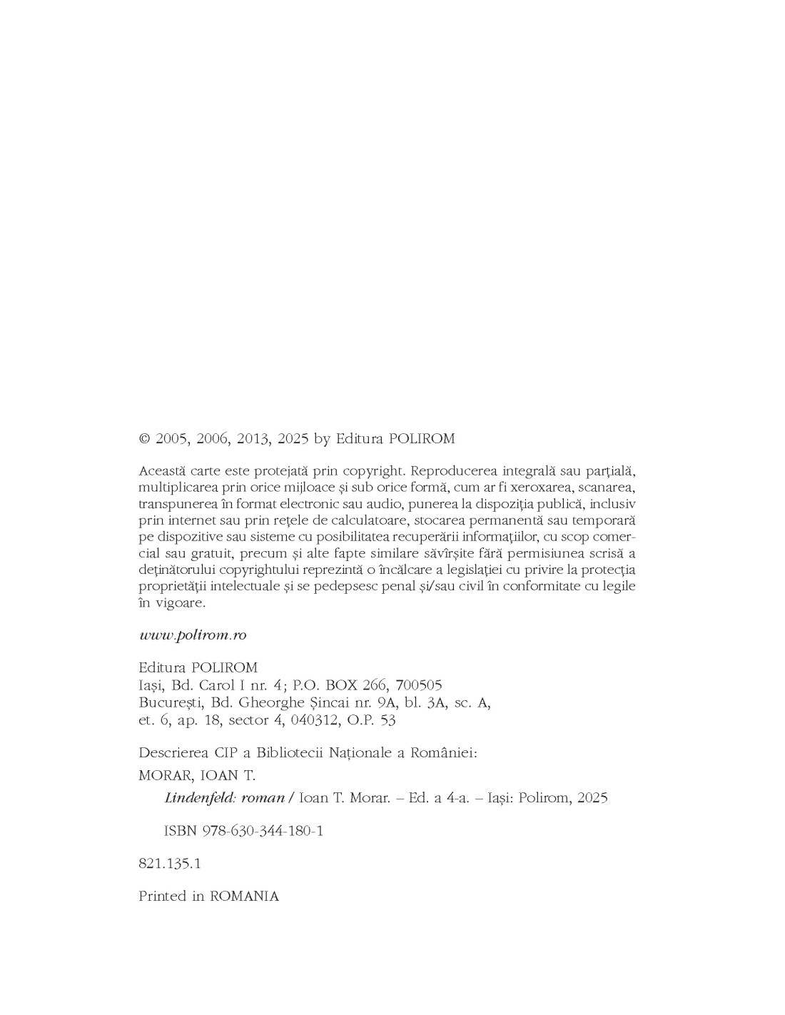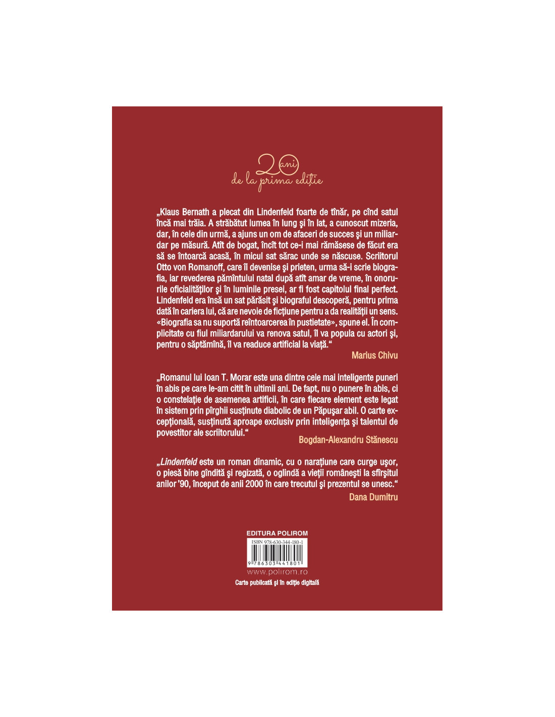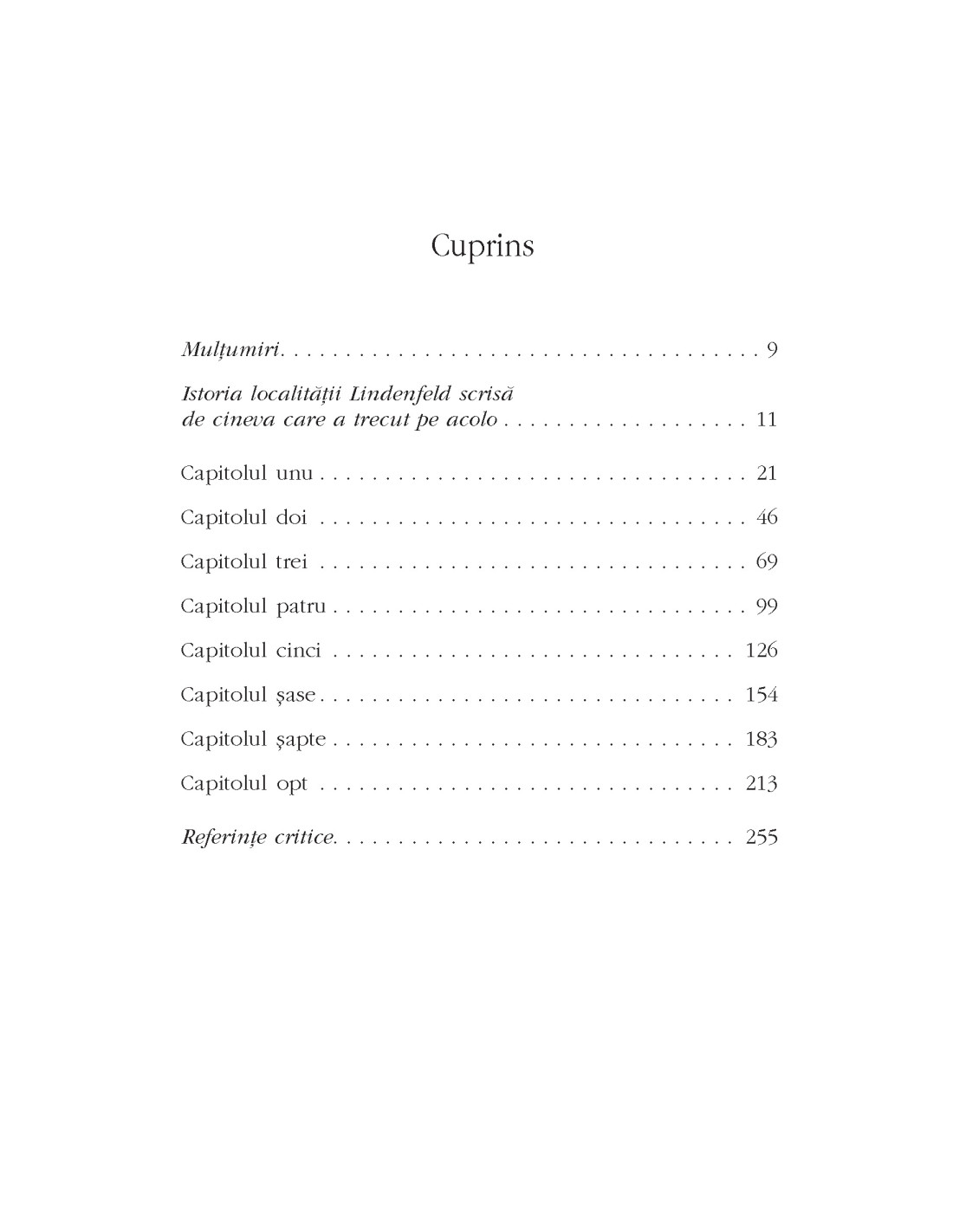 „Lindenfeld este un roman dinamic, cu o naraţiune care curge uşor, o piesă bine gândită şi regizată, o oglindă a vieţii româneşti la sfârşitul anilor ’90, început de anii 2000 în care trecutul şi prezentul se unesc.”