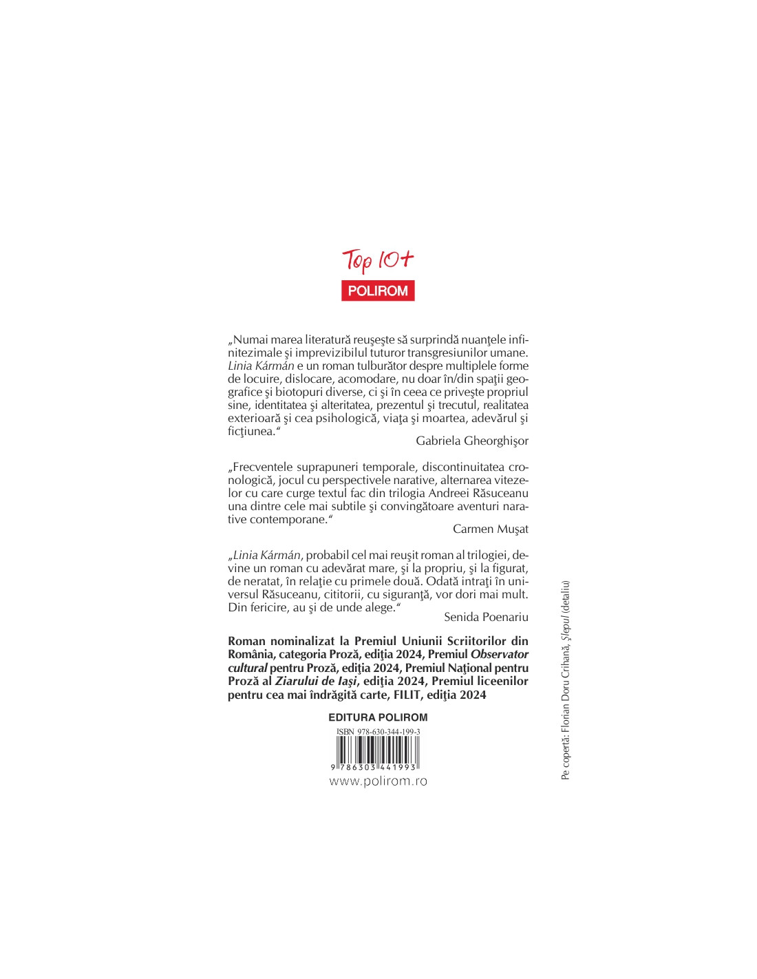 „Numai marea literatură reuşeşte să surprindă nuanţele infinitezimale şi imprevizibilul tuturor transgresiunilor umane. Linia Kármán e un roman tulburător despre multiplele forme de locuire, dislocare, acomodare, nu doar în/din spaţii geografice şi biotopuri diverse, ci şi în ceea ce priveşte propriul sine, identitatea şi alteritatea, prezentul şi trecutul, realitatea exterioară şi cea psihologică, viaţa şi moartea, adevărul şi ficţiunea.” (Gabriela Gheorghişor)