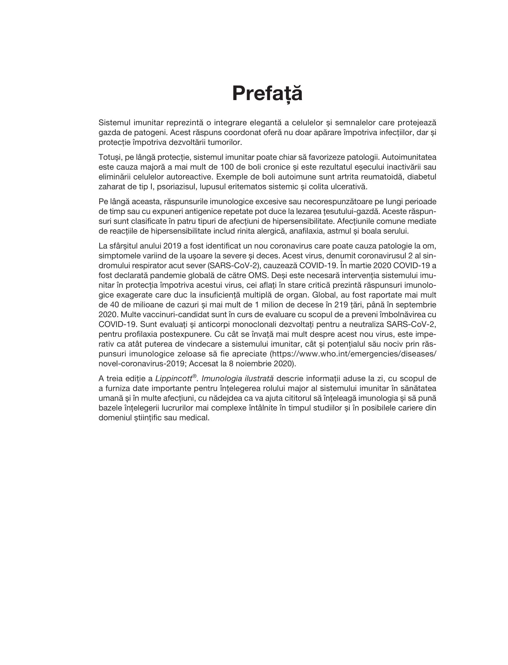 Lippincott®. Imunologia ilustrată (ediția a treia) furnizează datele fundamentale pentru înțelegerea rolului major al sistemului imunitar în sănătatea umană și în multe afecțiuni. Nu numai că ajută la cunoașterea conceptelor specifice imunologiei, ci este concepută ca un instrument de studiu și perfecționare esențial pentru o carieră de succes în domeniul științific sau medical. Folosită separat sau împreună cu alte resurse informative, contribuie la pregătirea solidă a studenților la medicină și a medicilor atât pentru examene, cât și pentru activitatea clinică.