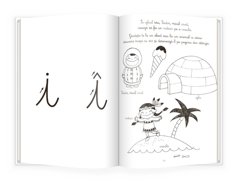 • literele alfabetului, cu indicații de urmărire a conturului cu degetele;