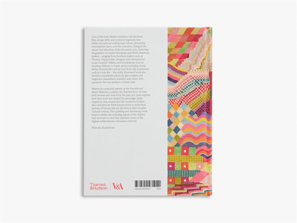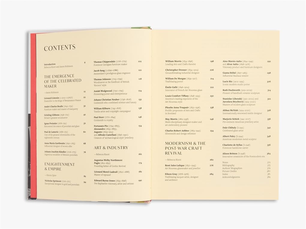 The book features forty illustrated biographies, ranging from furniture makers such as Thomas Chippendale to woodcarvers such as Grinling Gibbons, textile artists including Gunta Stölzl and ceramicists such as Lucie Rie, alongside goldsmiths, enamellists and many more. It also explores less familiar names who made a significant contribution to their field, brought together by their extraordinary skill and innovative use of technology and materials. While maintaining a focus on makers in Europe and North America, the book surveys a range of international influences in the biographies and thematic introductions. These thematic introductions also explore important moments in the history of the decorative arts, ranging from early modern craft and industrialization through to the Arts and Crafts Movement, modernism and the post-war craft revival.