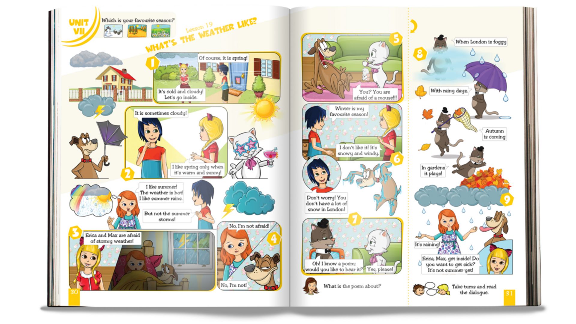 Anna, George și Erica își vor face prieteni noi, alături de care vor merge la film, la zoo, în parcul de distracții și în multe alte locuri frumoase. Fiecare lecție începe cu două pagini de benzi desenate care au ca noutate o latură predictivă. Firul narativ al textului este întrerupt de o întrebare predictivă, la care elevii trebuie să încerce să răspundă înainte de a afla sfârșitul acțiunii. Pentru a realiza acest lucru, pagina a doua a textului este îndoită spre interior. Conținuturile sunt însoțite de ilustrații sugestive, menite a-l ajuta pe elev în înțelegerea noțiunilor noi.