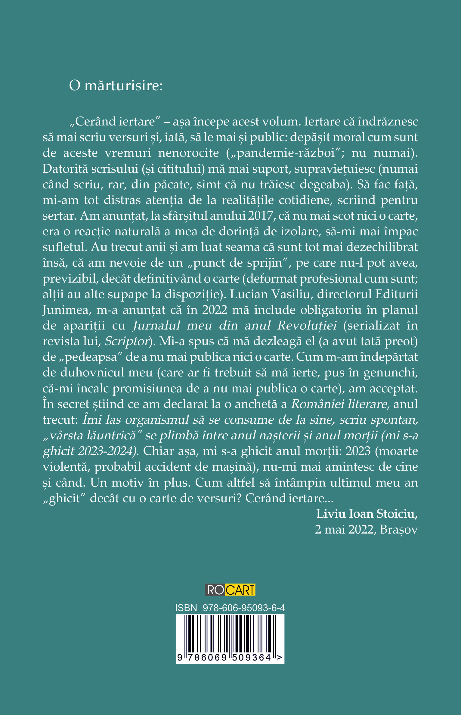 „Cerând iertare” – aşa începe acest volum. Iertare că îndrăznesc să mai scriu versuri şi, iată, să le mai şi public: depăşit moral cum sunt de aceste vremuri nenorocite („pandemie-război”; nu numai). Datorită scrisului (şi cititului) mă mai suport, supravieţuiesc (numai când scriu, rar, din păcate, simt că nu trăiesc degeaba). Să fac față, mi-am tot distras atenția de la realitățile cotidiene, scriind pentru sertar. Am anunțat, la sfârșitul anului 2017, că nu mai scot nici o carte, era o reacție naturală a mea de dorință de izolare, să-mi mai împac sufletul. Au trecut anii și am luat seama că sunt tot mai dezechilibrat însă, că am nevoie de un „punct de sprijin”, pe care nu-l pot avea, previzibil, decât definitivând o carte (deformat profesional cum sunt; alții au alte supape la dispoziție). Lucian Vasiliu, directorul Editurii Junimea, m-a anunțat că în 2022 mă include obligatoriu în planul de apariții cu Jurnalul meu din anul Revoluției (serializat în