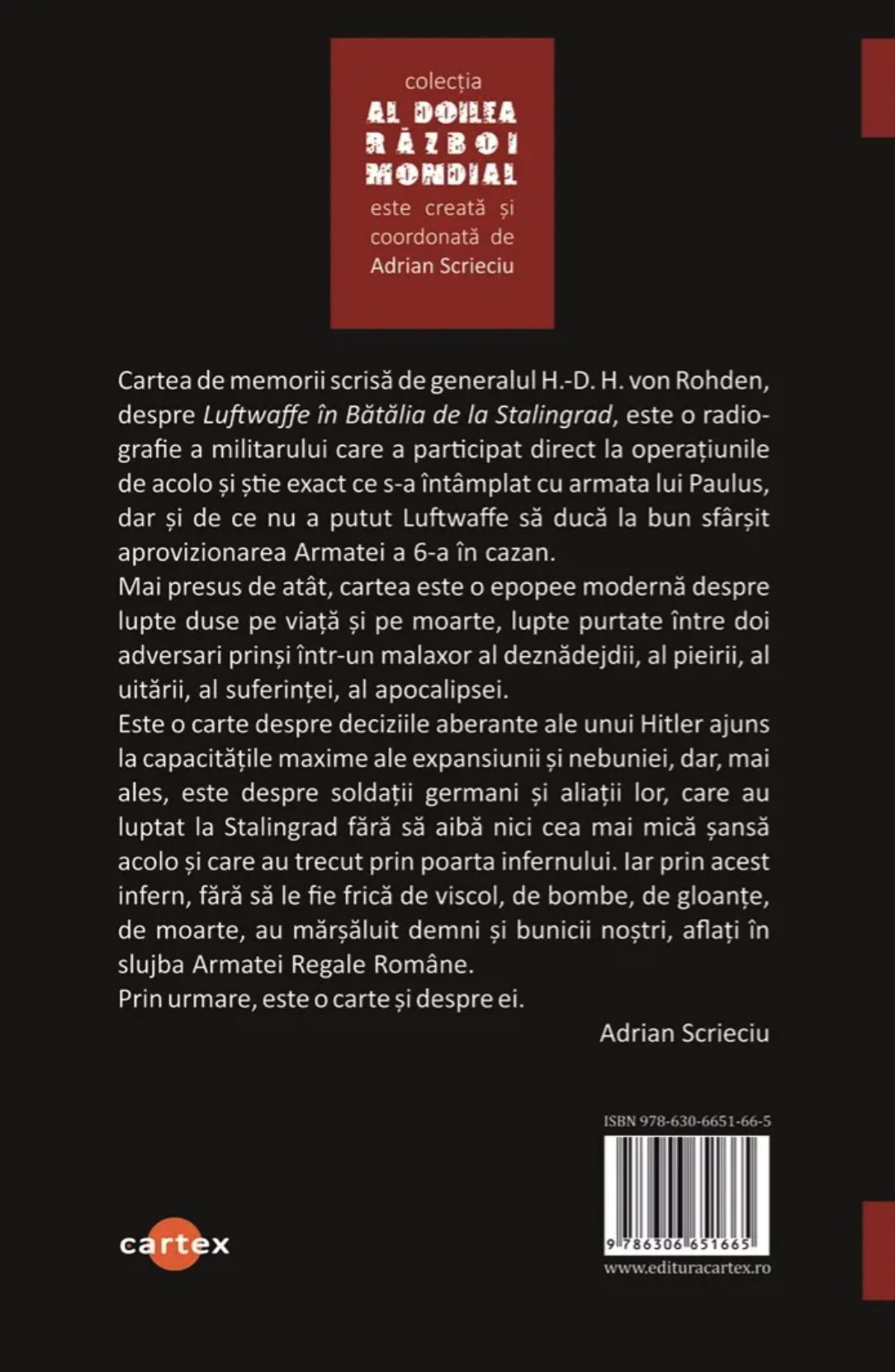 Cartea de memorii scrisa de generalul H.-D. H. von Rohden, despre Luftwaffe in Batalia de la Stalingrad, este o radiografie a militarului care a participat direct la operatiunile de pe front si din spatele acestuia.
