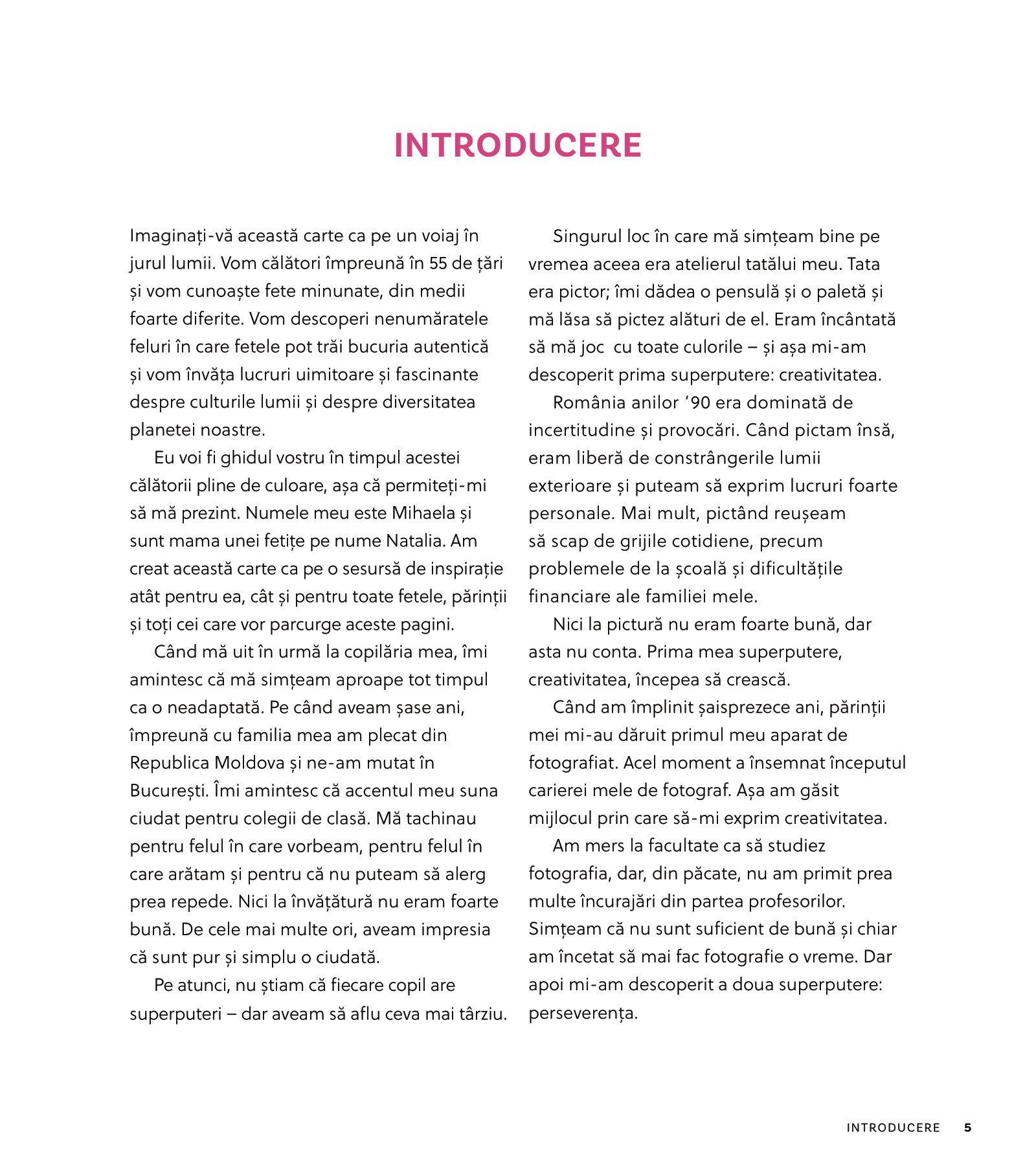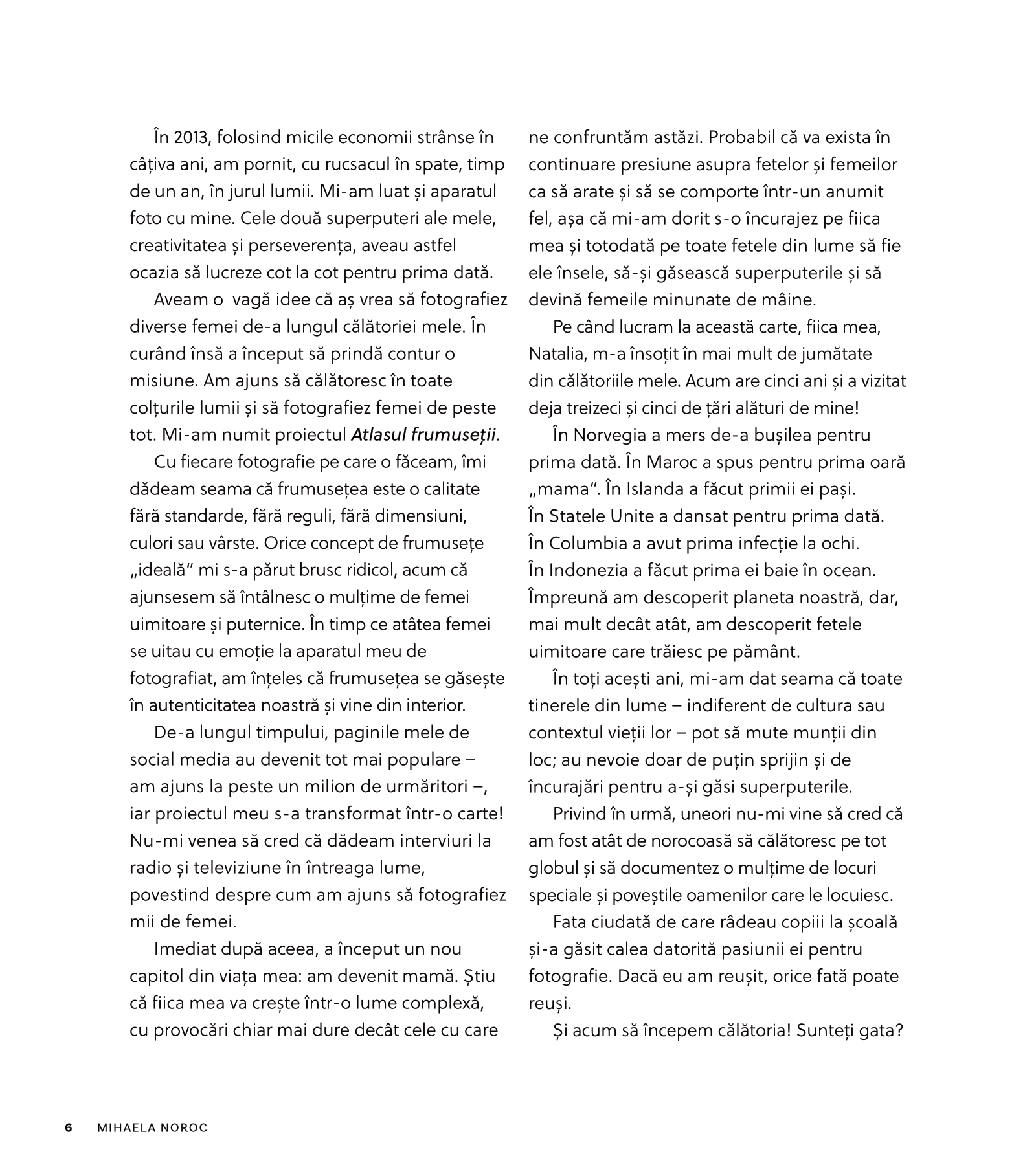 „Imaginați-vă această carte ca pe un voiaj în jurul lumii. Vom călători împreună în 55 de țări și vom cunoaște fete minunate, din medii foarte diferite. Vom descoperi nenumăratele feluri în care fetele pot trăi bucuria autentică și vom învăța lucruri uimitoare și fascinante despre culturile lumii și despre diversitatea planetei noastre. Mi-am dat seama că toate tinerele din lume – indiferent de cultura sau contextul vieții lor – pot să mute munții din loc; au nevoie doar de puțin sprijin și de încurajări.“ — MIHAELA NOROC