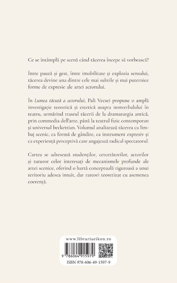 Această lucrare propune o reflecție sistematică asupra tăcerii ca structură teatrală, urmărind modul în care nonverbalul devine un instrument de construcție a sensului scenic. De la tragedia greacă și funcția tăcerii ca „non-răspuns”, la mima modernă și teatrul fizic, până la estetica pauzei în teatrul absurdului, volumul cartografiază un amplu teritoriu al expresivității fără cuvinte. Autorul analizează tăcerea din perspective multiple: estetică, fenomenologică, lingvistică, psihologică, teologică. Tăcerea nu apare aici ca simplă absență a cuvântului, ci ca formă activă de comunicare, ca „limbaj al corporalității”, ca spațiu al proiecțiilor spectatorului și ca probă de maturitate artistică a actorului. Prin incursiuni în opera lui Euripide, Eschil, Sofocle, Marceau, Beckett, dar și în teatrul fizic contemporan, volumul demonstrează că arta actorului se construiește adesea dincolo de rostire, în zona fină a gestului, a pauzei și a prezenței tensionate.
