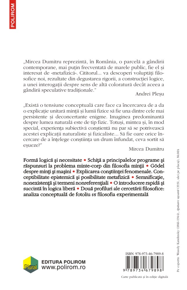 „Există o tensiune conceptuală care face ca încercarea de a da o explicație unitară minții și lumii fizice să fie una dintre cele mai persistente și deconcertante enigme. Imaginea predominantă despre lumea naturală este de tip fizic. Totuși, mintea și, în mod special, experiența subiectivă conștientă nu par să se potrivească acestei explicații naturaliste și fizicaliste... Să fie oare orice încercare de a înțelege conștiința un drum înfundat, ceva sortit să eșueze?” (Mircea Dumitru)