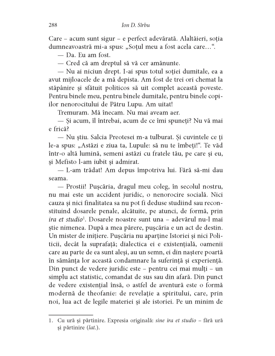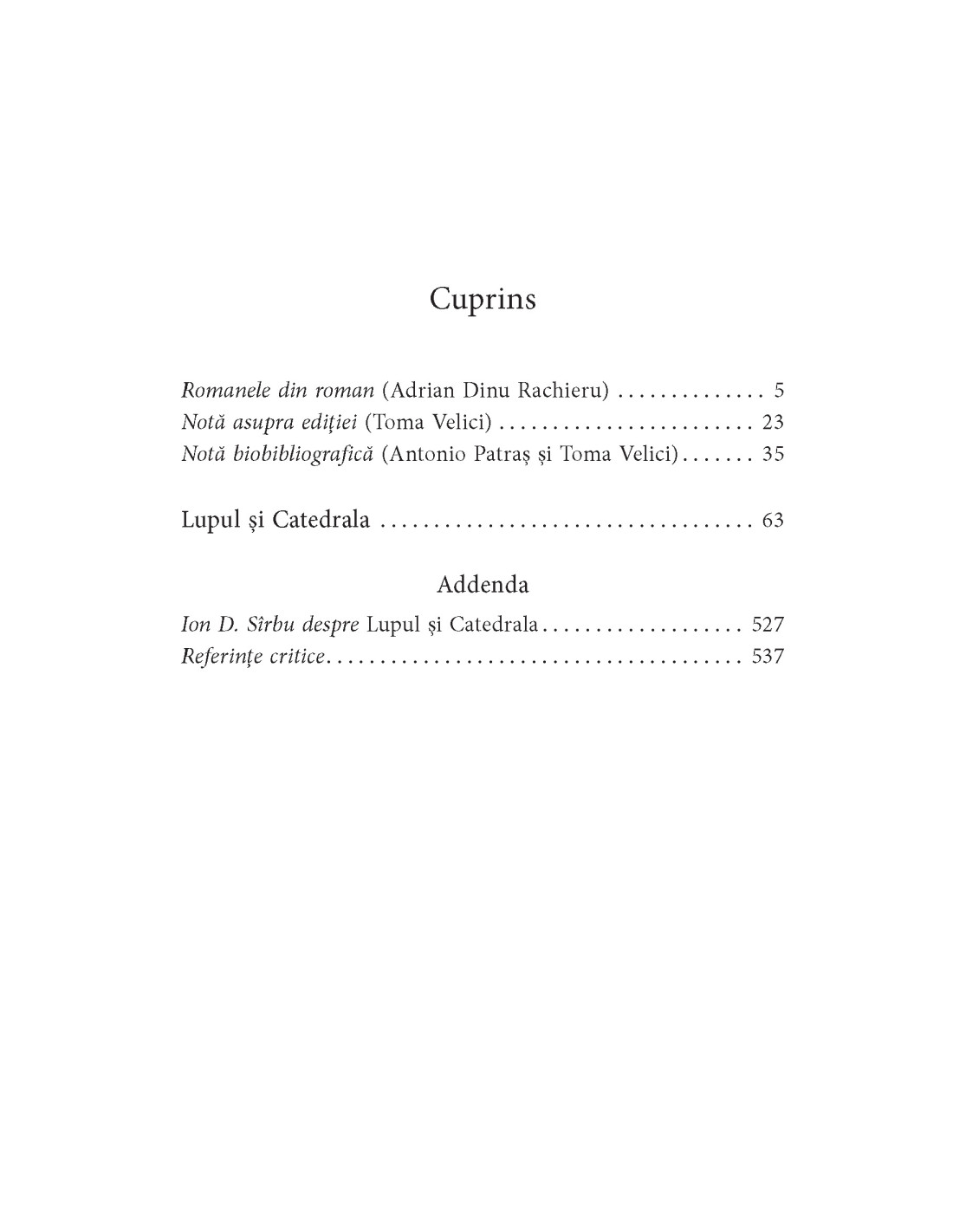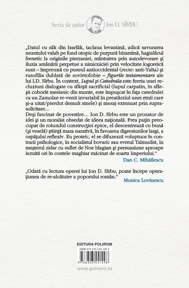 „Datul cu sâk din Isarlâk, taclaua levantină, adică savurarea neantului valah pe fond utopic de purpură bizantină, hagialâcul frenetic la originile pierzaniei, mântuirea prin autodevorare și iluzia amânării perpetue a nimicniciei prin velocitate logoreică sunt – împreună cu puseul antioccidental (recte: anti-Yalta) și rusofilia dublată de sovietofobie – figurile testamentare ale lui I.D. Sîrbu. În context, Lupul și Catedrala este feeria unei recluziuni dialogate cu sfârșit sacrificial (lupul carpatin, în sfârșit coborât mesianic din munte, este împușcat în fața catedralei ca un Zamolxe revenit invariabil în preatârziul unei etnii care și-a uitat/pierdut demult sinele) și mesaj extenuat prin suprasolicitare...