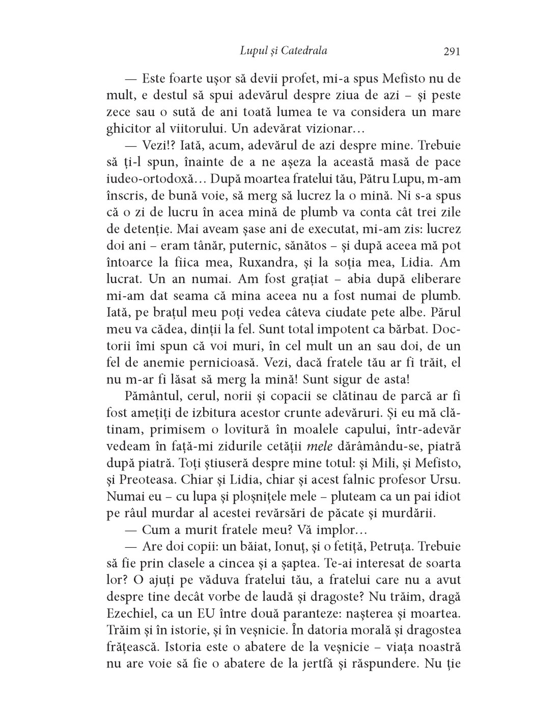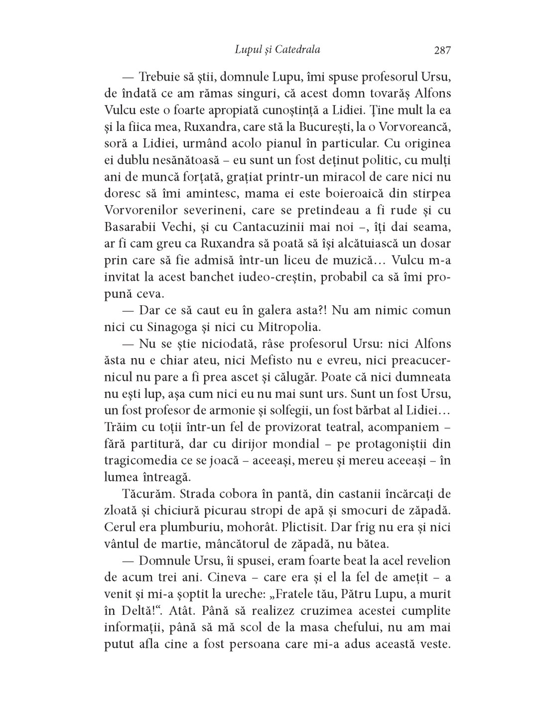 „Dacă acțiunea din Adio, Europa! posedă calitatea rară să se desfășoare în plină epocă ceaușistă (perioadă ocultată literar și astăzi pentru prea multele complicații intelectuale la care a dat loc) și-i redă nota «ubuescă» specifică, momentul evocat de Lupul și Catedrala aparține anului 1956, respectiv perioadei «dejiste». Autorul adoptă aici stratagema utilizată de majoritatea confraților săi: situează marasmul social-moral pe care-l descrie într-o vreme considerată depășită, prin înlăturarea «abuzurilor» și restaurarea legalității de către noul conducător al partidului…