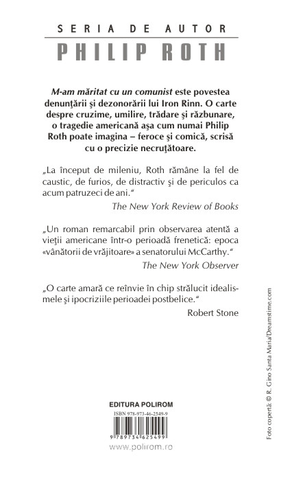 M-am maritat cu un comunist este povestea denuntarii si dezonorarii lui Iron Rinn. O carte despre cruzime, umilire, tradare si razbunare, o tragedie americana asa cum numai Philip Roth poate imagina – feroce si comica, scrisa cu o precizie necrutatoare.