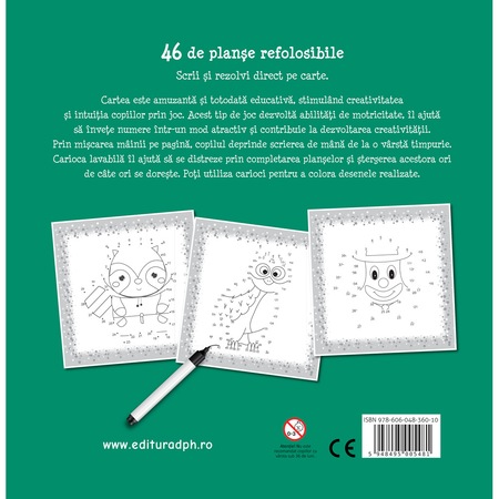 Imaginile descoperite dupa completarea planselor ii vor captiva pe micuti si vor contribui, astfel, la invatarea prin joc. Copiii pot utiliza carioca pentru a colora desenele realizate.