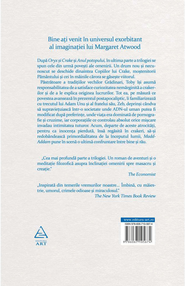După Oryx și Crake și Anul potopului, în ultima parte a trilogiei se spun cele din urmă povești ale omenirii. Un drum nou și necunoscut se deschide dinainte Copiilor lui Crake, moștenitorii Pământului și cei în mâinile cărora se găsește viitorul.