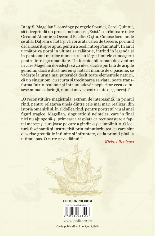„O reconstituire magistrală, extrem de interesantă, în primul rînd, pentru relatarea uneia dintre cele mai mari realizări din istoria omenirii şi, în al doilea rînd, pentru portretul viu al unei figuri tragice, Magellan, singuratic şi neînţeles, care în final nici nu ajunge să-şi primească răsplata ca recunoaştere a faptei măreţe şi curajoase pe care a gîndit-o şi a împlinit-o. O lectură fascinantă şi instructivă prin minuţiozitatea cu care sînt descrise greutăţile întîlnite şi înfruntate, de la primul pînă la ultimul pas. O carte ce va dăinui.” (Kirkus Reviews)