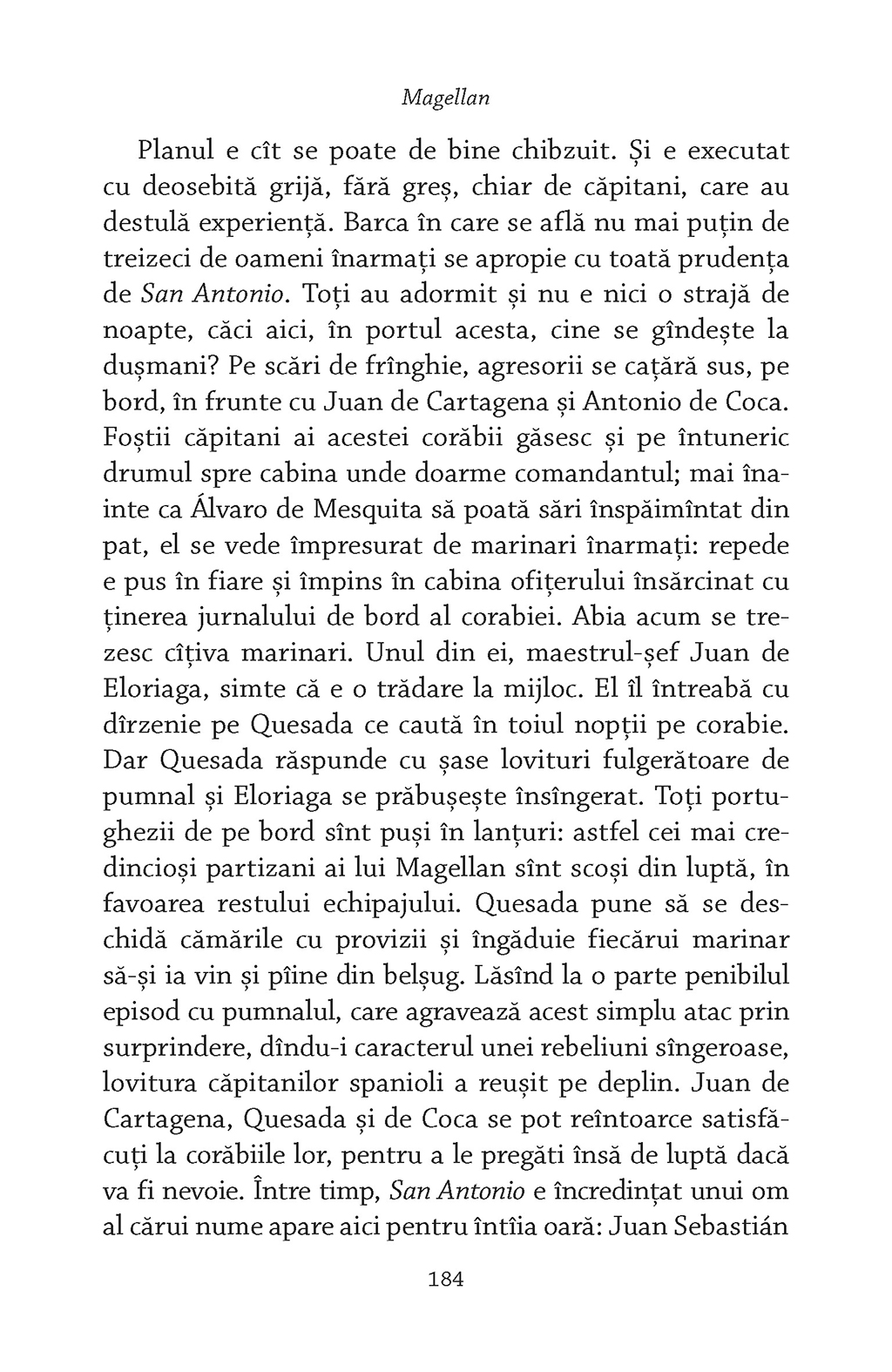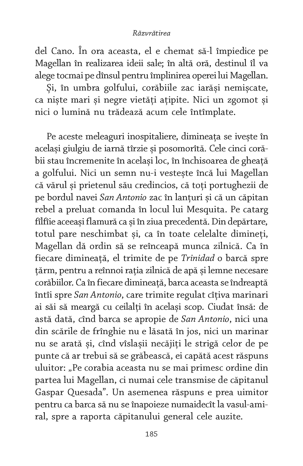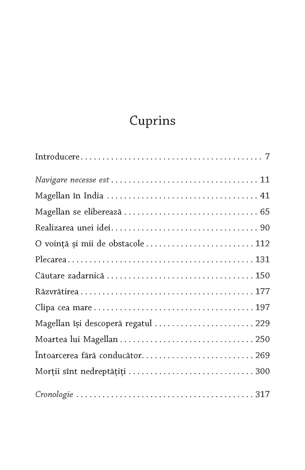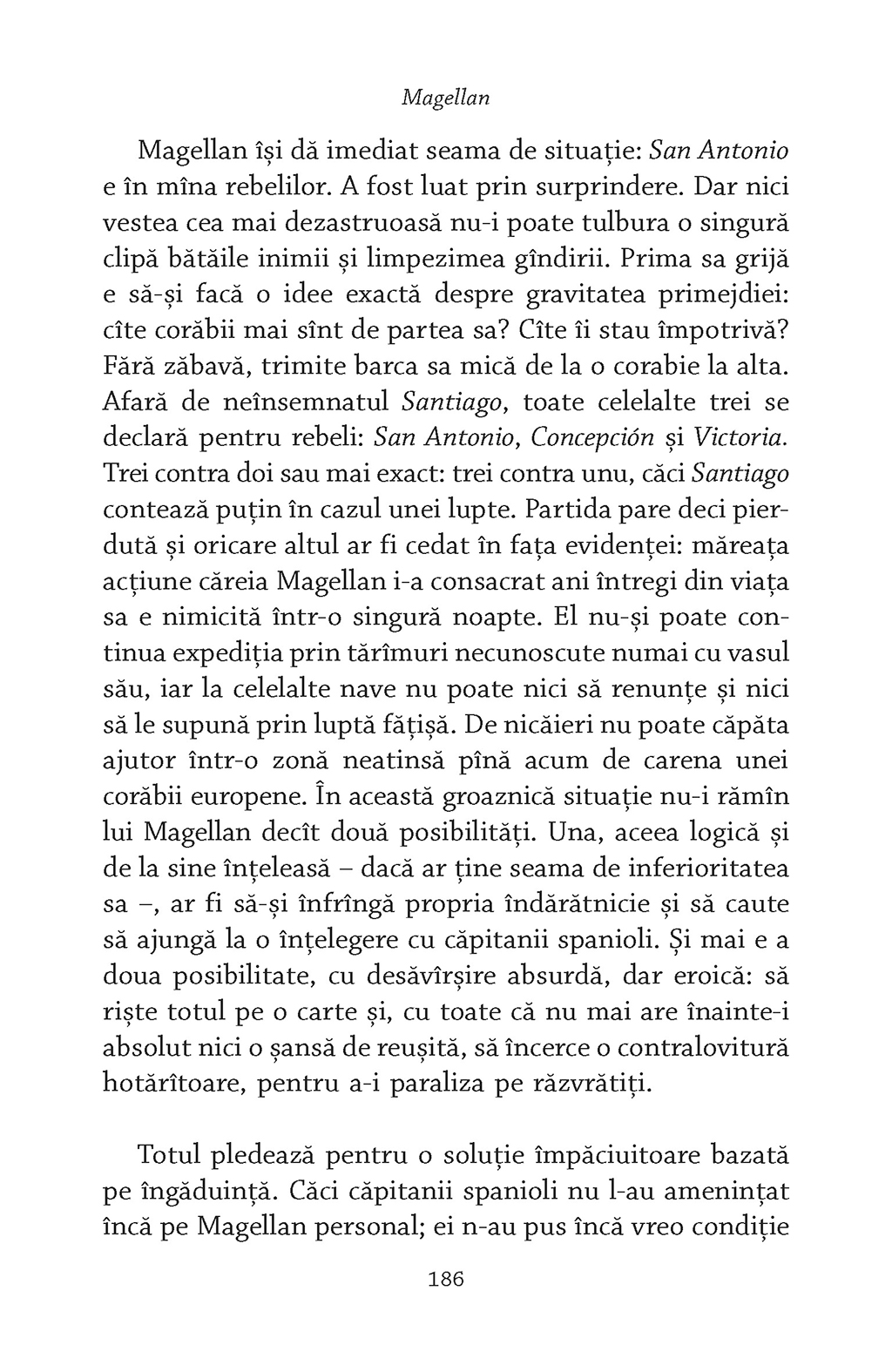 În 1518, Magellan îl convinge pe regele Spaniei, Carol Quintul, să întreprindă un proiect nebunesc: „Există o strîmtoare între Oceanul Atlantic şi Oceanul Pacific. O ştiu. Cunosc locul unde se află. Daţi‑mi o flotă şi vă voi arăta calea de trecere, pornind de la răsărit spre apus, pentru a ocoli întreg Pămîntul”. În anul următor va porni în ultima sa călătorie, intrînd în legendă şi în panteonul marilor nume care au lărgit limitele cunoaşterii pentru întreaga umanitate. Un formidabil roman de aventuri în care Magellan dovedeşte că „o idee, dacă e purtată de aripile geniului, dacă e dusă mereu şi hotărît înainte de o pasiune, se vădeşte la urmă mai puternică decît toate elementele naturii, că un singur om, cu scurta şi trecătoarea sa viaţă, poate transforma într‑o realitate şi într‑un adevăr nepieritor ceea ce fusese numai o dorinţă, numai un vis pentru sute de generaţii”.