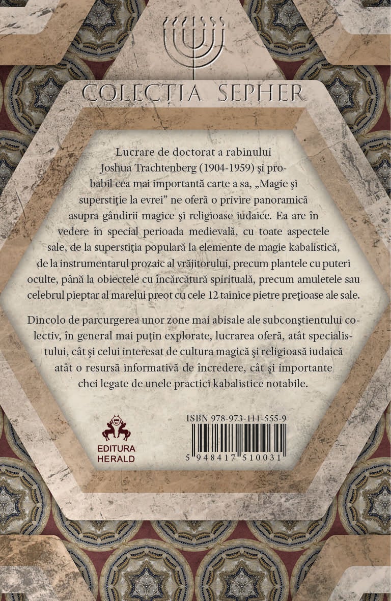 Lucrare de doctorat a rabinului Joshua Trachtenberg (1904-1959) si probabil cea mai importanta carte a sa, „Magie si superstitie la evrei” ne ofera o privire panoramica asupra gandirii magice si religioase iudaice. Ea are in vedere in special perioada medievala, cu toate aspectele sale, de la superstitia populara la elemente de magie cabalistica, de la instrumentarul prozaic al vrajitorului, precum plantele cu puteri oculte, pana la obiectele cu incarcatura spirituala, precum amuletele sau celebrul pieptar al marelui preot cu cele 12 tainice pietre pretioase ale sale. Dincolo de parcurgerea unor zone mai abisale ale subconstientului colectiv, in general mai putin explorate, lucrarea ofera, atat specialistului, cat si celui interesat de cultura magica si religioasa iudaica atat o resursa informativa de incredere, cat si importante chei legate de unele practici cabalistice notabile.