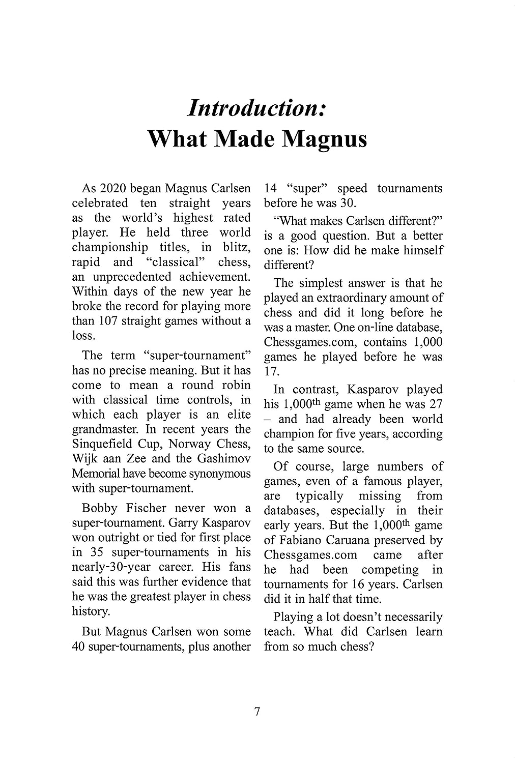 Magnus Carlsen has been the world’s number one player for more than a decade, has won more super-tournaments than anyone ever and is still in his prime. He is the only player to repeatedly win the world championships in classical, speed and blitz chess formats. This book details his remarkable rise and how he acquired the crucial skills of 21st-century grandmaster chess