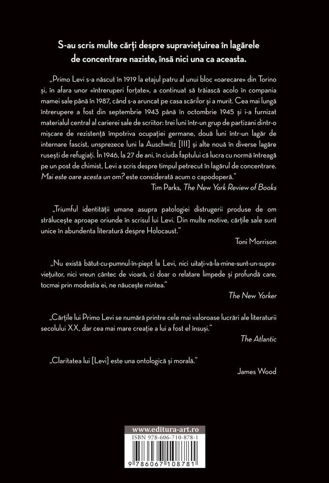„Primo Levi s-a născut în 1919 la etajul patru al unui bloc «oarecare» de apartamente din Torino și, în afara unor «întreruperi forțate», a continuat să trăiască acolo în compania mamei sale până în 1987 când s-a aruncat pe casa scărilor și a murit. Cea mai lungă întrerupere a fost din septembrie 1943 până în octombrie 1945 și i-a furnizat materialul central al carierei sale de scriitor: trei luni într-un grup de partizani dintr-o mișcare de rezistență împotriva ocupației germane, două luni într-un lagăr de internare fascist, unsprezece luni la Auschwitz [III] și alte nouă în diverse lagăre rusești de refugiați. În 1946, la 27 de ani, în ciuda faptului că lucra cu normă întreagă pe un post de chimist, Levi a scris despre timpul petrecut în lagărul de concentrare. Mai este oare acesta un om? este considerată acum o capodoperă.” Tim Parks, The New York Review of Books