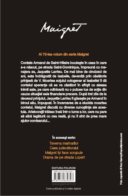 Contele Armand de Saint-Hilaire locuieste in casa in care s-a nascut, pe strada Saint-Dominique, impreuna cu menajera sa, Jaquette Larrieu. De mai bine de cincizeci de ani, este indragostit de Isabelle, devenita prin casatorie printesa de V. Moartea sotului octogenar al Isabellei ii da contelui sperante ca se va casatori in sfirsit cu aleasa inimii sale, pe care odinioara nu o putuse lua de sotie din cauza situatiei sale financiare precare. Dupa trei zile de la decesul printului, Jaquette Larrieu il gaseste pe Armand in biroul sau, impuscat. In incercarea de a elucida moartea contelui, Maigret discuta cu diverse cunostinte ale acestuia. Aristocratii traiesc insa intr-o lume a lor, care nu pare sa aiba legatura cu cea reala, si nu ii sint de prea mare ajutor comisarului...