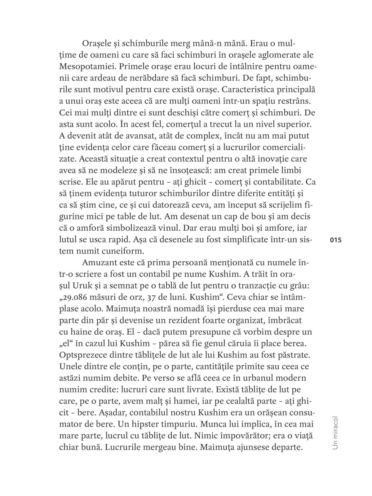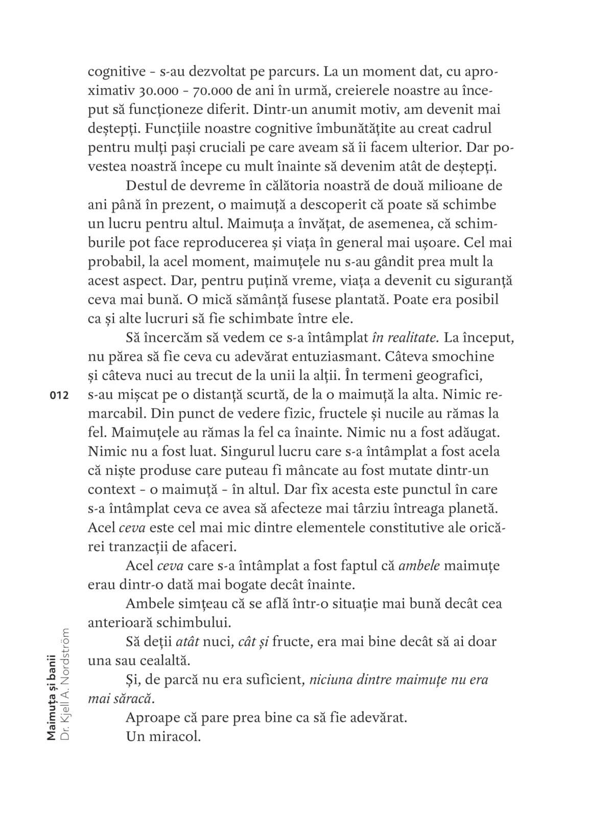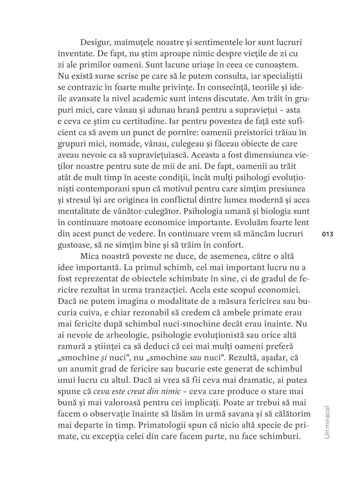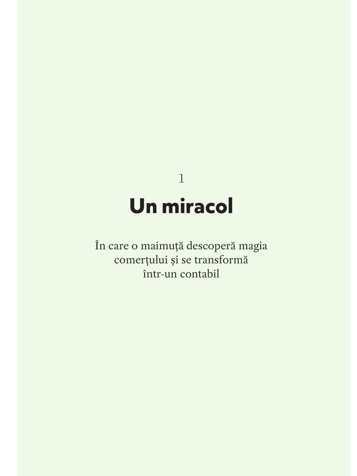 Povestea începe cu câteva milioane de ani în urmă, cu două maimuțe fictive care au schimbat lucruri între ele și, drept urmare, au devenit mai fericite. Ele au descoperit un principiu extrem de puternic și de benefic, care ulterior a ajuns să ne domine viețile și, prin urmare, istoria. Principiul învăluie întreaga lume într-o ceață densă de tranzacții, în care toată lumea participă, făcând schimburi cu orice. Această ceață primește într-un final un nume, beneficiază de o întreagă fraternitate de experți și de propria ei ramură științifică: economia.