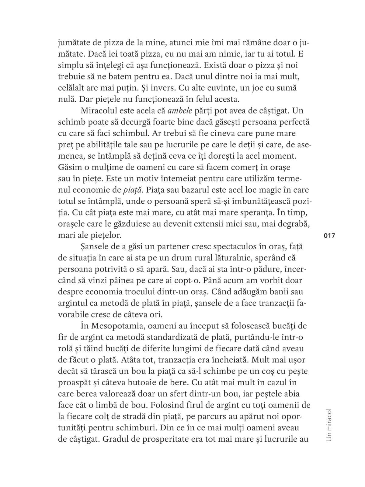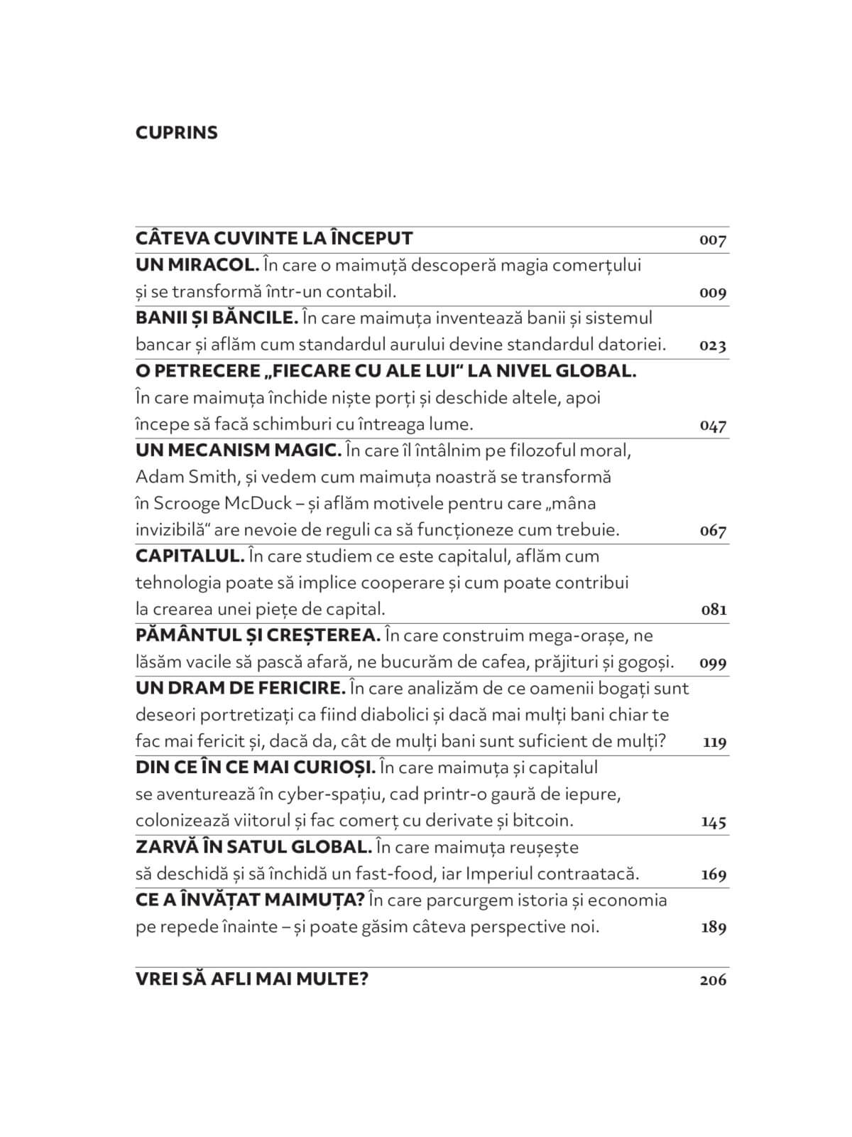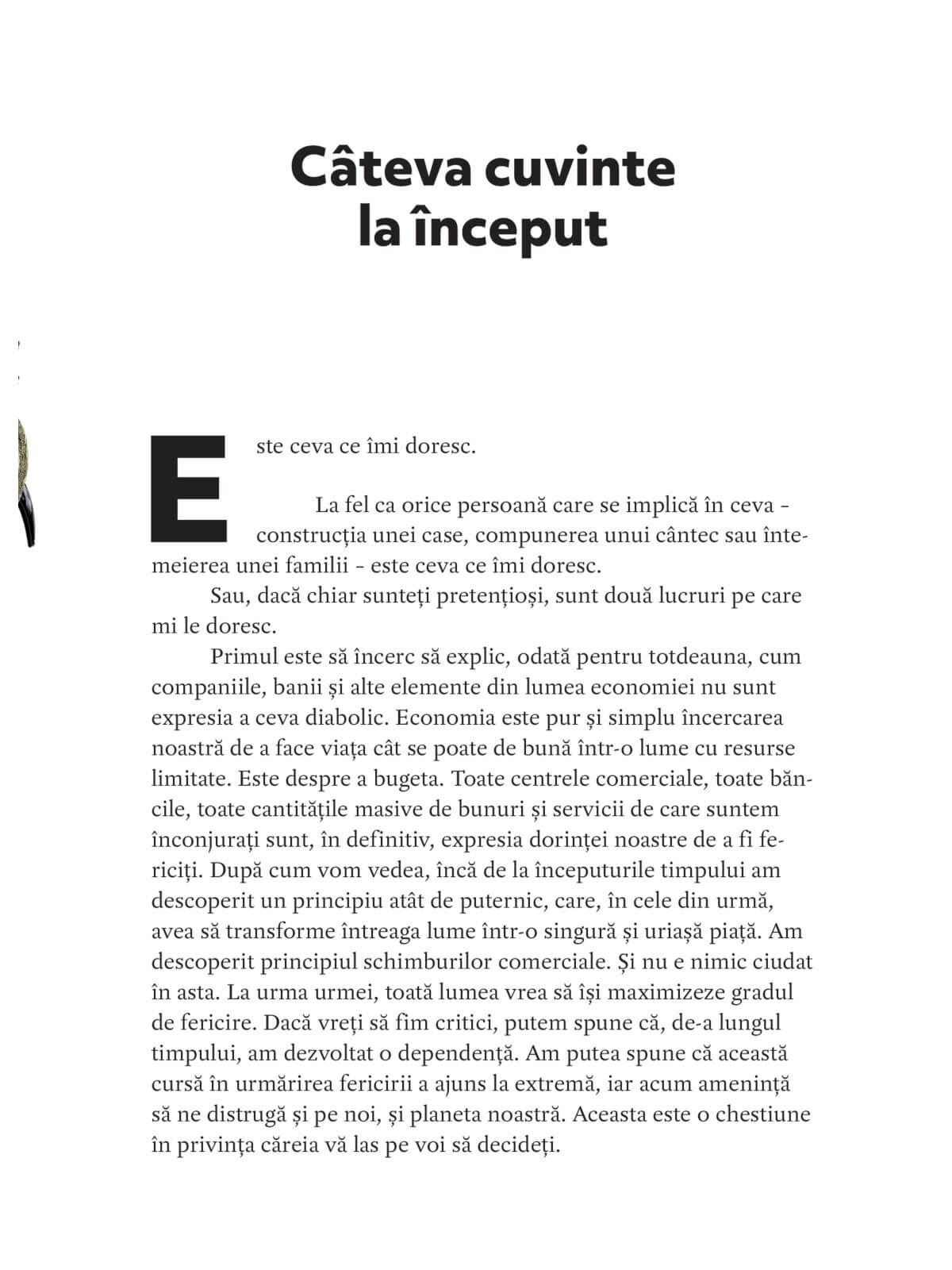 Companiile, banii și celelalte elemente din lumea economiei nu sunt expresia a ceva diabolic. Economia este pur și simplu încercarea noastră de a face viața cât se poate de bună într-o lume cu resurse limitate. După cum veți vedea, încă de la începuturile timpului am descoperit principiul schimburilor comerciale, care avea să transforme întreaga lume într-o singură și uriașă piață. Am putea spune că această cursă în urmărirea fericirii a ajuns la extremă, iar acum amenință să ne distrugă și pe noi, și planeta noastră.