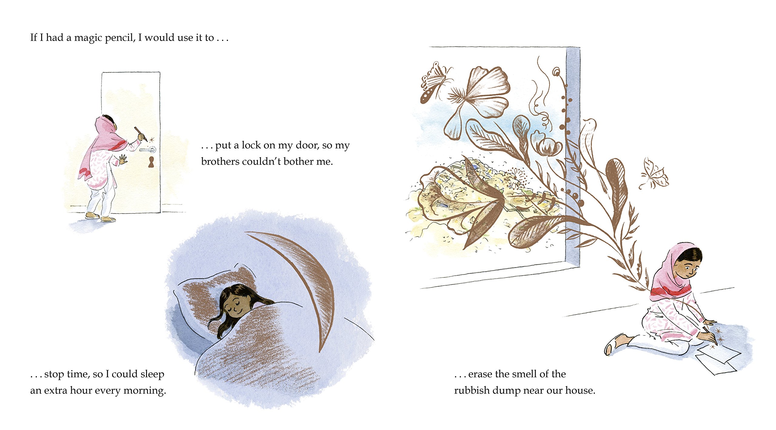 As a child in Pakistan, Malala made a wish for a magic pencil that she could use to redraw reality. She would use it to give gifts to her family, to erase the smell from the rubbish dump near her house, to sleep an extra hour in the morning. As she grew older, Malala wished for bigger and bigger things. She saw a world that needed fixing. And even if she never found a magic pencil, Malala realized that she could still work hard every day to make her wishes come true.