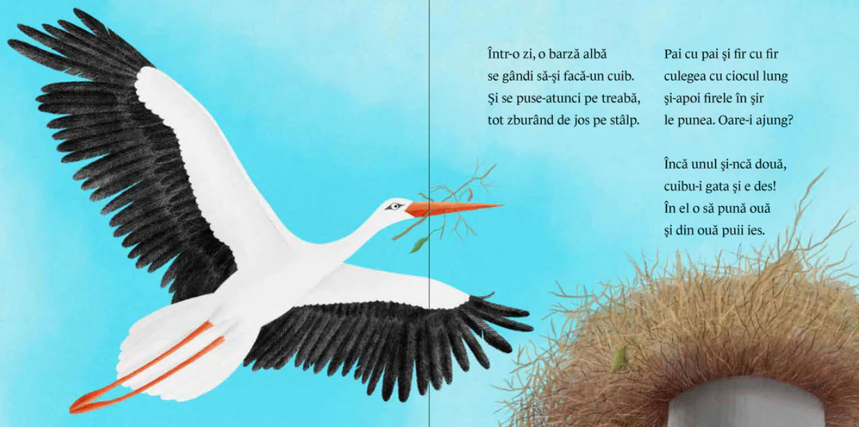 Mama Barză lucrează de zor, construiește un cuib încăpător pentru puii ei, care vor ieși în curând din ouă.