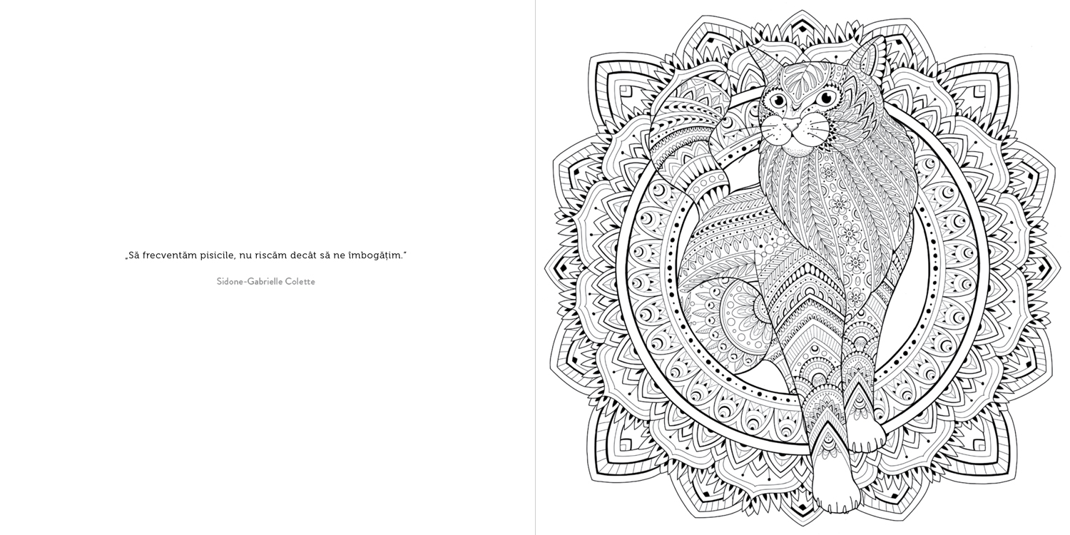 Teme: pisici, artă decorativă, mindfulness, citate inspiraționale, relaxare prin colorat.