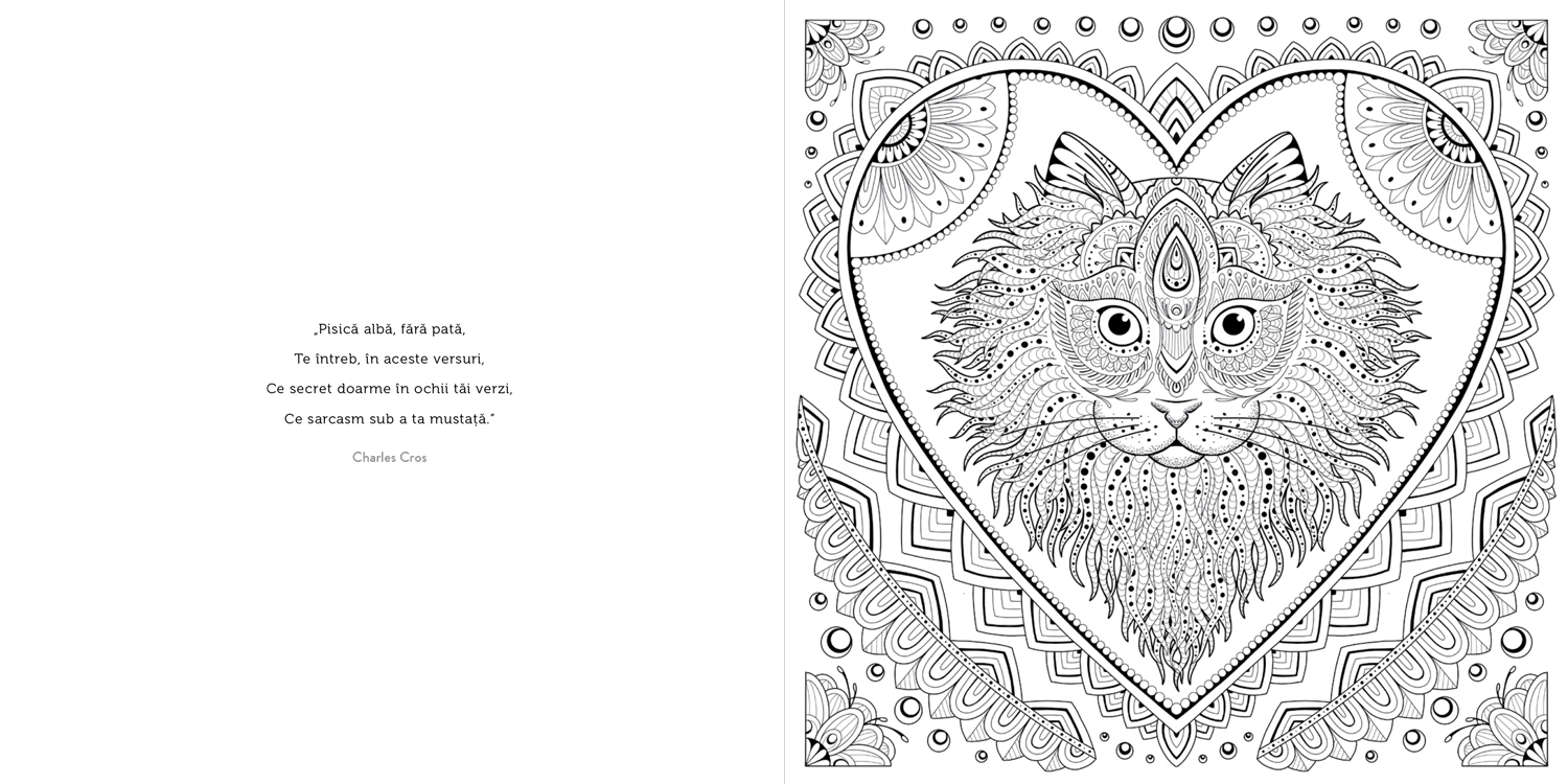 O colecție de mandale elegante și expresive, dedicate universului felin, însoțite de citate inspiraționale despre pisici, semnate de gânditori, scriitori și artiști celebri precum Victor Hugo, Jules Verne, Colette, Baudelaire sau Apollinaire.