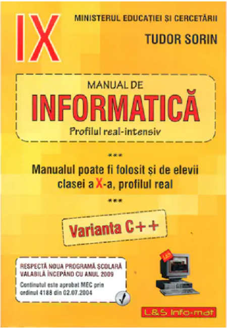 Respecta programa scolara actuala, valabila incepand cu anul 2009. Manualul scolar se adreseaza elevilor de liceu care studiaza informatica, profiul real-intensiv si este avizat MEC cu ordinul nr. 4188/02.07.2004. Manualul poate fi folosit si de elevii clasei a X-a, profilul real! VariantaC++ Clasa a IX-a Filiera teoretica, profil real, Specializarile: Matematica-Informatica, Intensiv Informatica. Filiera vocationala, profil militar, Specializarile: Matematica-Informatica,Intensiv Informatica Clasa a X-a. Filiera teoretica, profil real, Specializarile: Matematica-Informatica,Stiinte ale naturii. Filiera vocationala, profil militar, Specializarea: Matematica-Informatica.