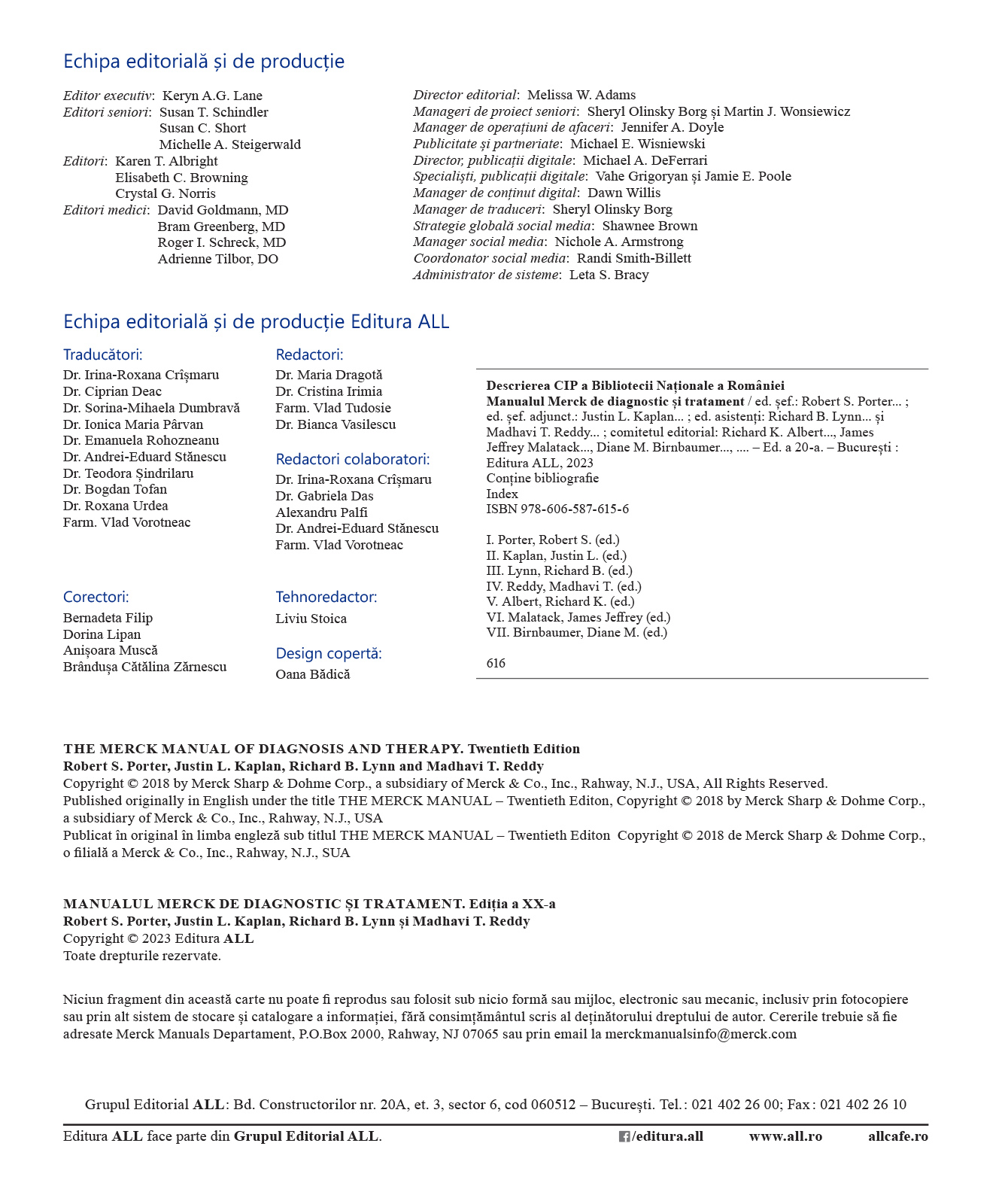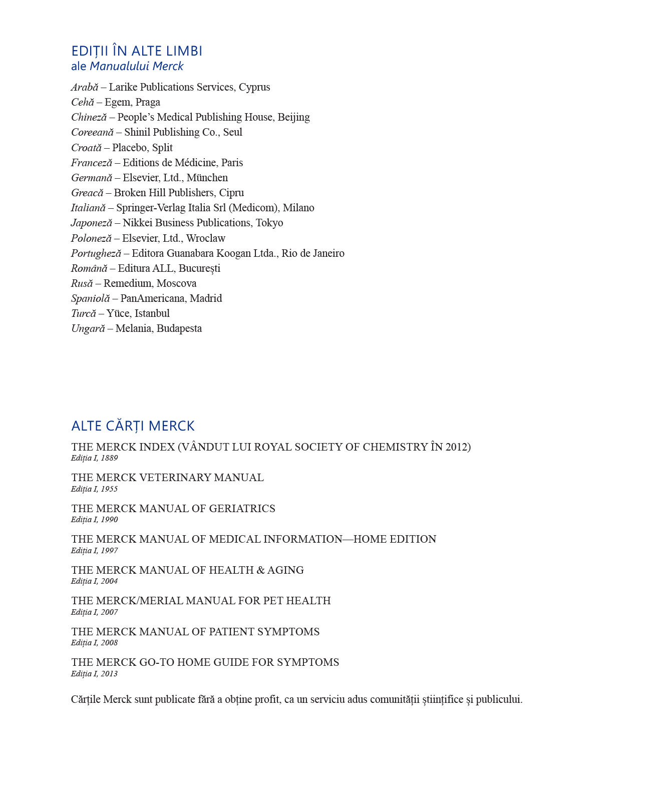Cu o tradiţie de 120 de ani de excelenţă în acoperirea a mii de subiecte din toate ariile medicinei, Manualul MERCK a ajuns la ediţia a XX-a, mai cuprinzătoare ca oricând, grație abordării exhaustive a medicilor renumiți care au contribuit la realizarea sa.