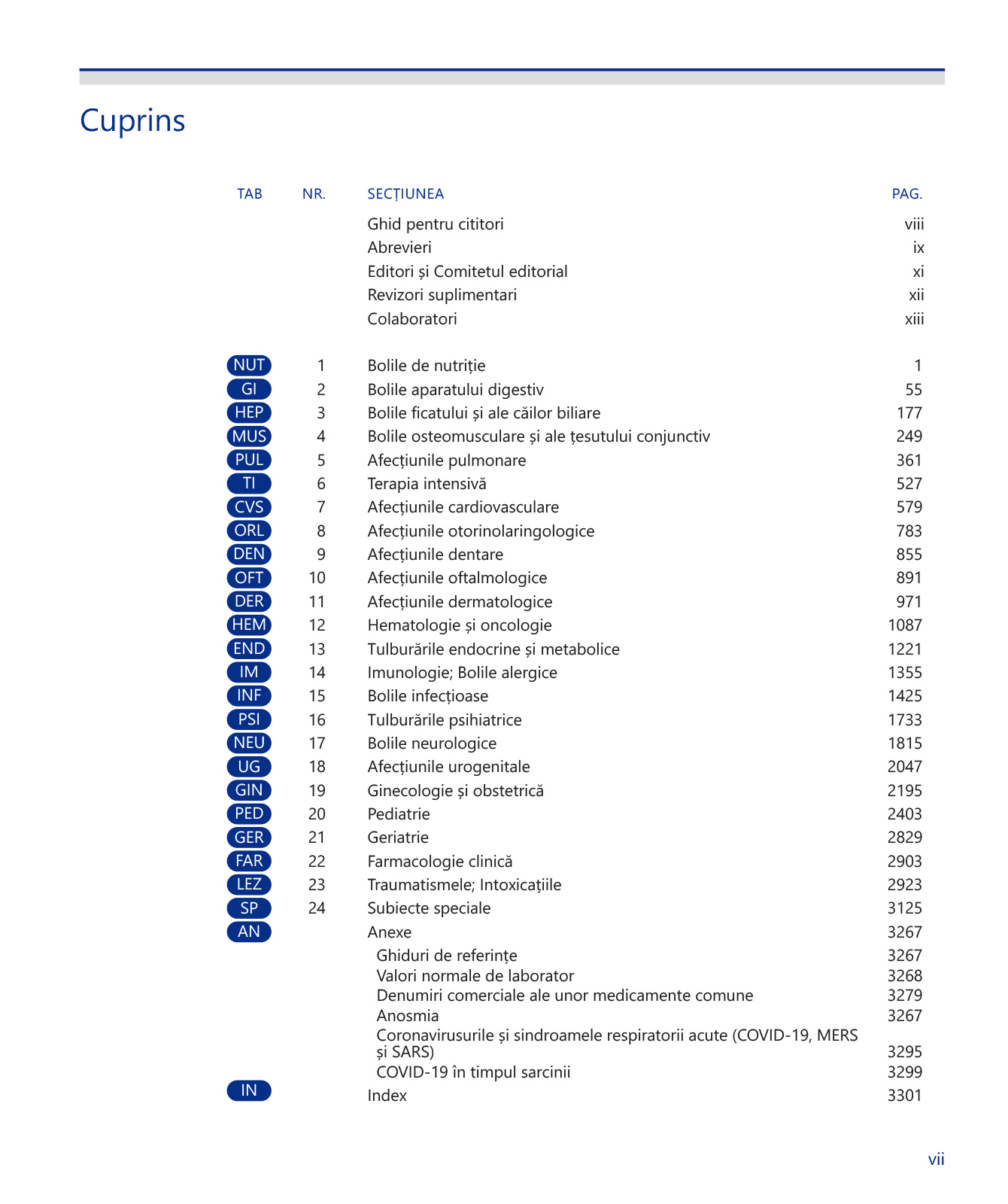 Afecțiunile specifice sunt organizate pe sisteme de organe sau pe specialitatea medicală, iar această structură extrem de riguros gândită transformă tratatul într-un instrument practic, ușor de consultat și de parcurs. Informațiile urmăresc evoluția unei afecțiuni din momentul în care aceasta trebuie suspectată și prezintă ordinea adecvată a evaluării pacientului, apoi oferă opțiunile terapeutice de primă linie, împreună cu alternativele selectate. Mai mult decât atât, furnizează informații solide privind etiologia și fiziopatologia, astfel încât să asigure înțelegerea recomandărilor de management. Punctele-cheie care încheie subiectele abordate sumarizează cele mai importante caracteristici de reținut.