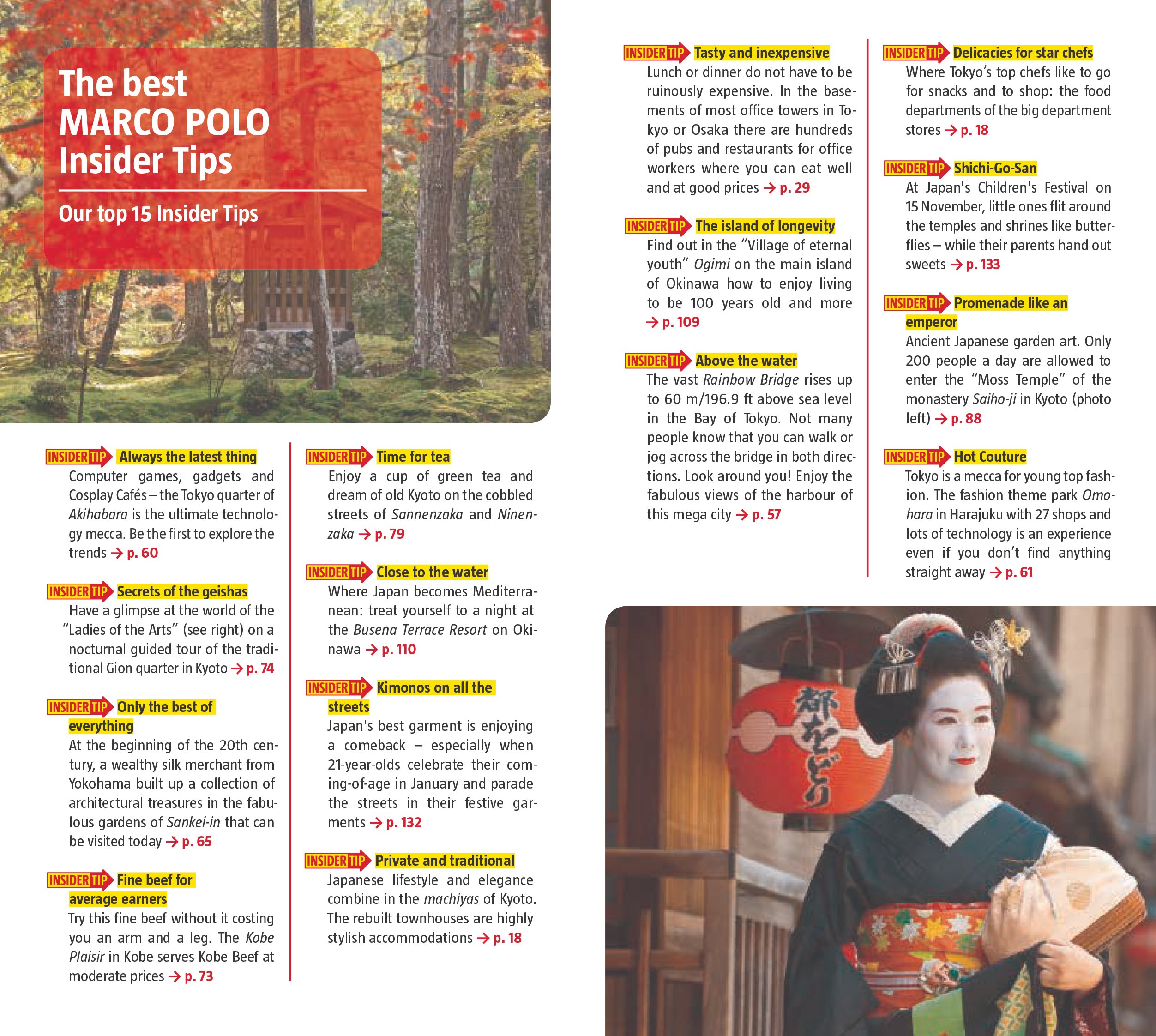 • Insider Tips - enjoy fantastic views across Tokyo from the Rainbow Bridge, experience fine Japanese cuisine or promenade like an emperor in an ancient Japanese garden. Let Marco Polo show you the hidden gems and little known secrets that offer a real insight into Japan.