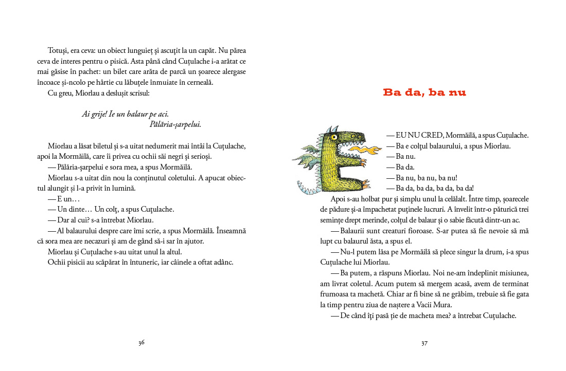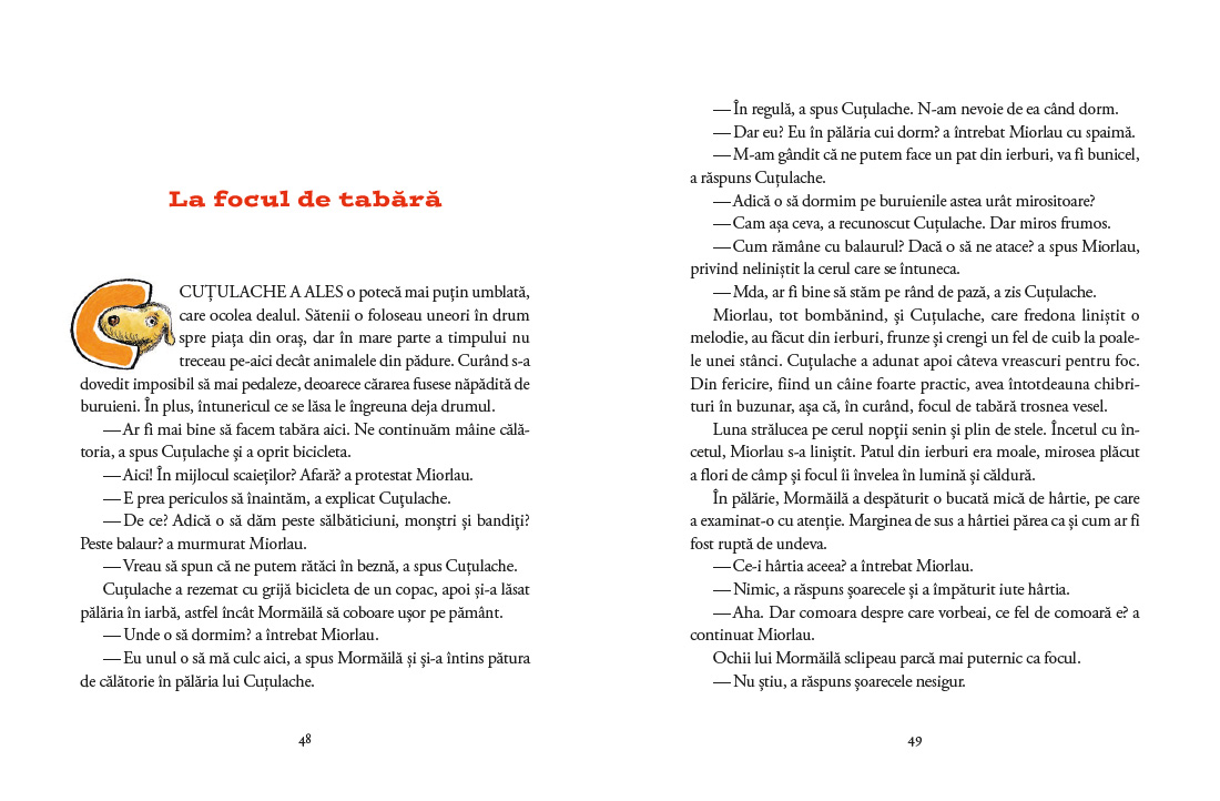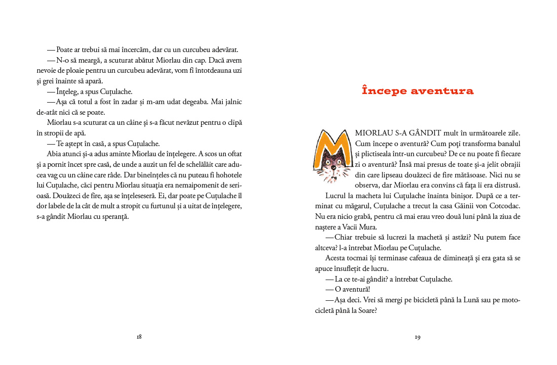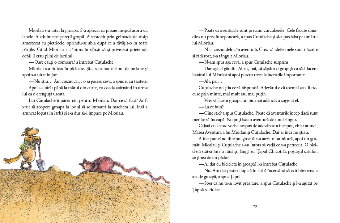 „Marea aventură” este al doilea roman din seria „Miorlau și Cuțulache“, despre o pisică și un câine care trăiesc într-o casă albastră „ca seninul cerului” de pe vârful unui deal.