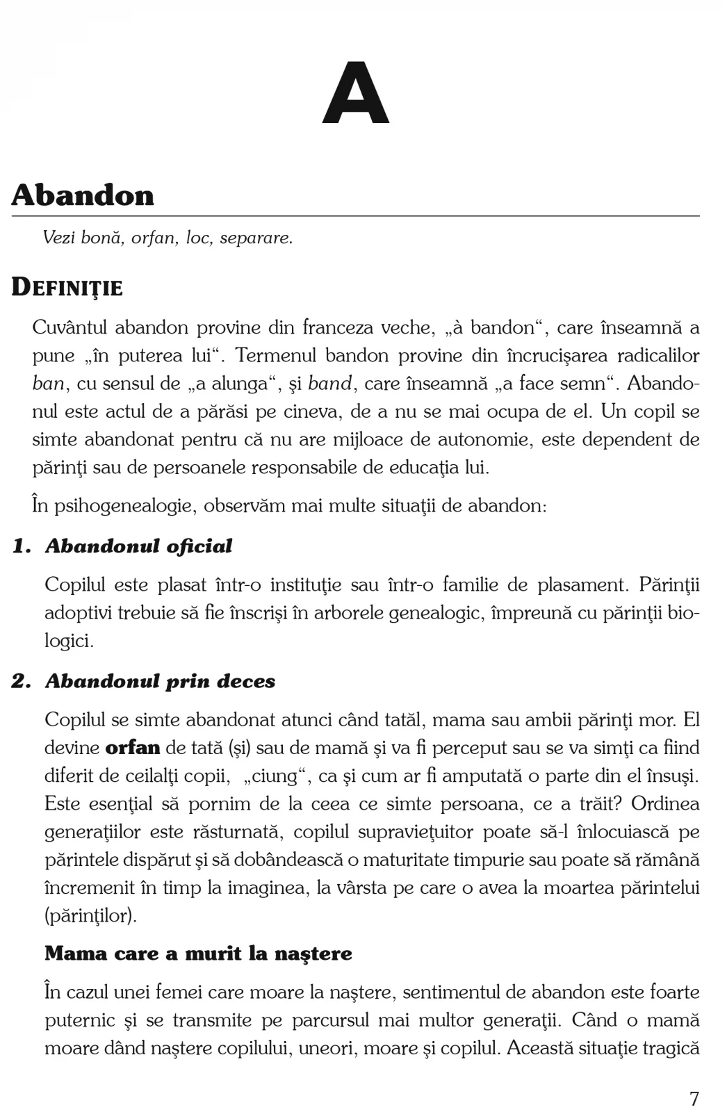 Dictionarul este primul publicat pe aceasta tema si prezinta o cercetare originala, bazata pe povestile de viata ale pacientilor. Se doreste a fi un ajutor eficient pentru eliberarea de repetitiile inconstientului familial, pornind de la prenume, de la date aniversare de nastere, de casatorie, de deces si de la situatii traite de stramosi.