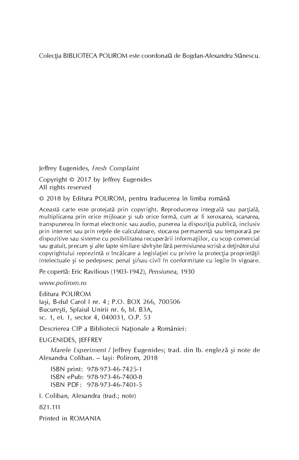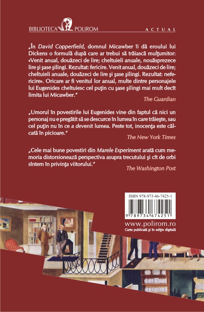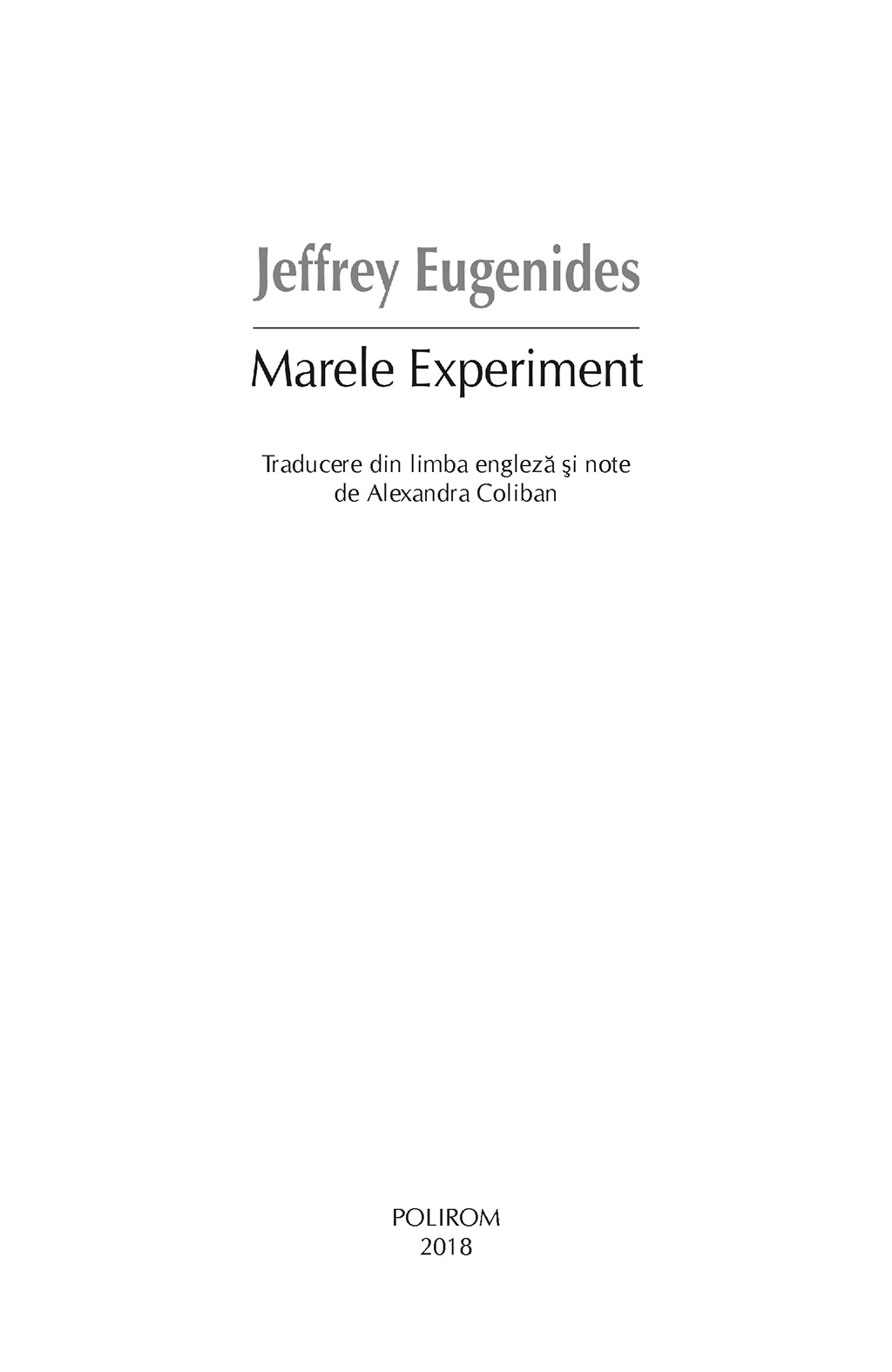 O femeie de carieră la patruzeci de ani care îşi doreşte cu disperare un copil organizează o „petrecere de inseminare”, unde bărbaţii sînt încurajaţi să doneze spermă. Un poet ratat pune la cale escrocheria menită să îi asigure o viaţă liniştită într-un paradis fiscal. O elevă de liceu încearcă să se sustragă căsătoriei aranjate de familia ei de imigranţi. Toate personajele Marelui Experiment, primul volum de proză scurtă al lui Jeffrey Eugenides, se află în pragul unei crize, urmarea firească a propriilor decizii neinspirate şi a imaturităţii, tot ce (li) se întîmplă are legătură cu o enormă urgenţă universală. Scrise frumos, convingător, pline de idei neaşteptate, dar nelipsite de graţie, aceste povestiri marchează maturitatea unui mare scriitor american.