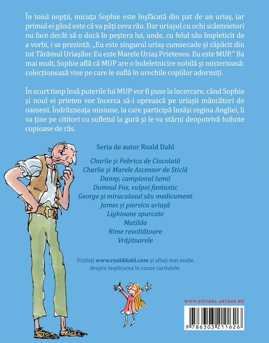 În toiul nopţii, micuţa Sophie este înşfăcată din patul ei de un uriaş, iar primul ei gând este că va păți ceva rău. Dar uriaşul cu ochi scânteietori nu face decât să o ducă în peştera lui, unde, cu felul lui împleticit de a vorbi, i se prezintă: “Eu este singurul uriaş cumsecade şi zăpăcit din tot Tărâmul Uriaşilor. Eu este Marele Uriaş Prietenos. Eu este MUP.” Ba mai mult, Sophie află că MUP are o îndeletnicire nobilă şi misterioasă: colecţionează vise pe care le suflă în urechile copiilor adormiţi.